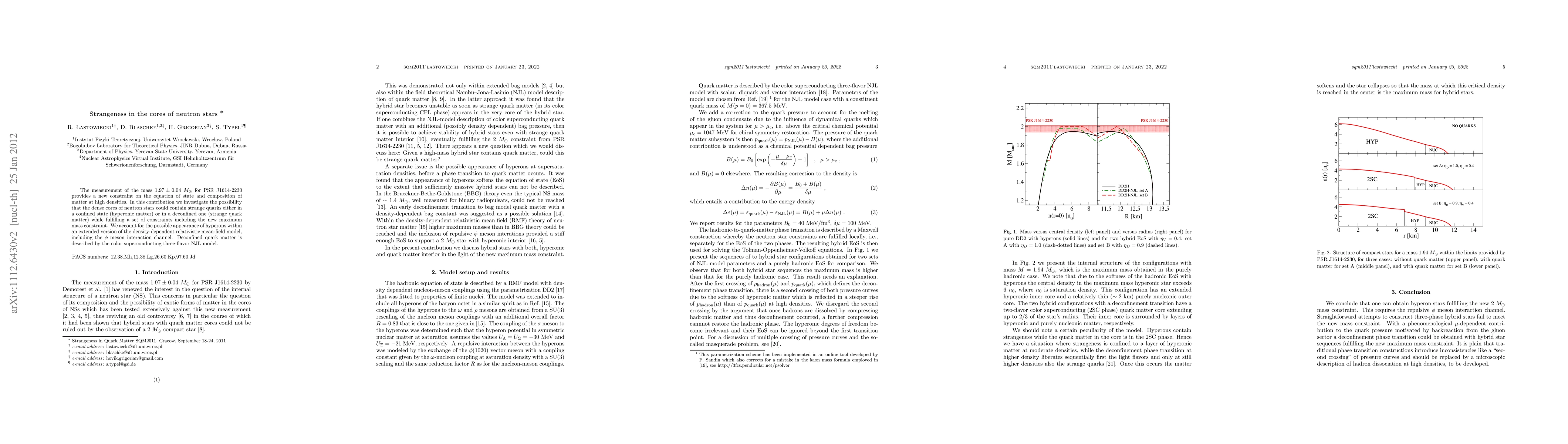 Researchers investigate the possibility of strange quarks in neutron star cores, using a new mass constraint to test for hyperonic and deconfined quark matter states.