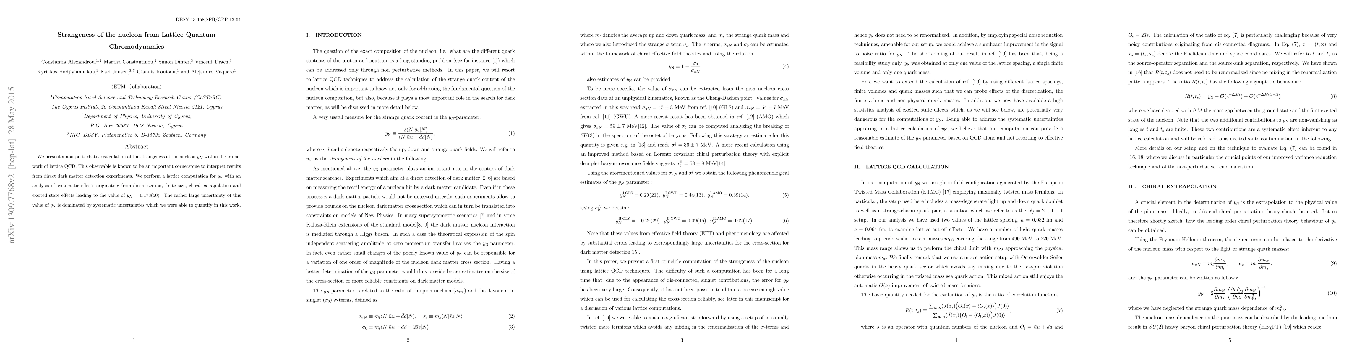 This paper reports a non-perturbative lattice QCD calculation of the nucleon's strangeness $y_N$, yielding a value of $y_N=0.173(50)$, with significant systematic uncertainties affecting the result. The study analyzes various sources of error to quantify these uncertainties.