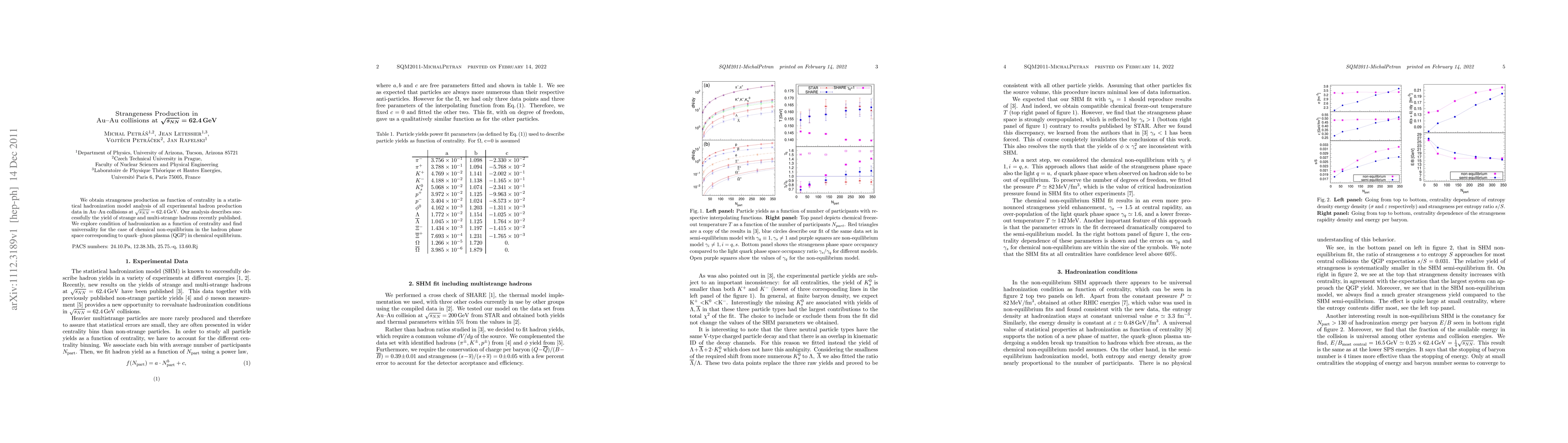 We obtain strangeness production as function of centrality in a statistical hadronization model analysis of all experimental hadron production data in Au--Au collisions at $\sqrt{s_{NN}}=62.4\GeV$. Our analysis describes successfully the yield of strange and multi-strange hadrons recently published. We explore condition of hadronization as a function of centrality and find universality for the case of chemical non-equilibrium in the hadron phase space corresponding to quark--gluon plasma (QGP) in chemical equilibrium.