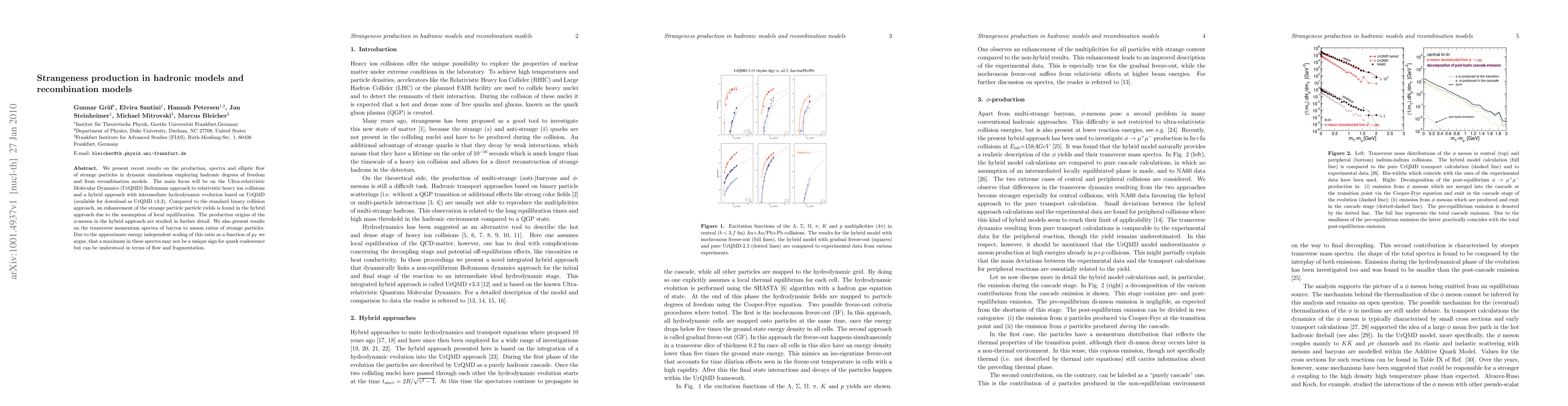 We present recent results on the production, spectra and elliptic flow of strange particles in dynamic simulations employing hadronic degrees of freedom and from recombination models. The main focus will be on the Ultra-relativistic Molecular Dynamics (UrQMD) Boltzmann approach to relativistic heavy ion collisions and a hybrid approach with intermediate hydrodynamic evolution based on UrQMD (available for download as UrQMD v3.3). Compared to the standard binary collision approach, an enhancement of the strange particle particle yields is found in the hybrid approach due to the assumption of local equilibration. The production origins of the Phi-meson in the hybrid approach are studied in further detail. We also present results on the transverse momentum spectra of baryon to meson ratios of strange particles. Due to the approximate energy independent scaling of this ratio as a function of p_T we argue, that a maximum in these spectra may not be a unique sign for quark coalescence but can be understood in terms of flow and fragmentation.