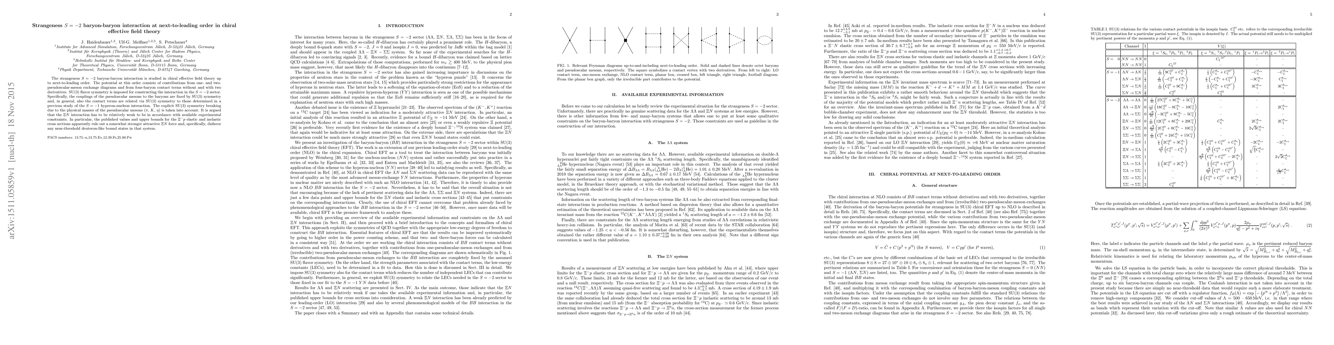 The strangeness $S=-2$ baryon-baryon interaction is studied in chiral effective field theory up to next-to-leading order. The potential at this order consists of contributions from one- and two-pseudoscalar-meson exchange diagrams and from four-baryon contact terms without and with two derivatives. SU(3) flavor symmetry is imposed for constructing the interaction in the $S=-2$ sector. Specifically, the couplings of the pseudoscalar mesons to the baryons are fixed by SU(3) symmetry and, in general, also the contact terms are related via SU(3) symmetry to those determined in a previous study of the $S=-1$ hyperon-nucleon interaction. The explicit SU(3) symmetry breaking due to the physical masses of the pseudoscalar mesons ($\pi$, $K$, $\eta$) is taken into account. It is argued that the $\Xi N$ interaction has to be relatively weak to be in accordance with available experimental constraints. In particular, the published values and upper bounds for the $\Xi^- p$ elastic and inelastic cross sections apparently rule out a somewhat stronger attractive $\Xi N$ force and, specifically, disfavor any near-threshold deuteron-like bound states in that system.