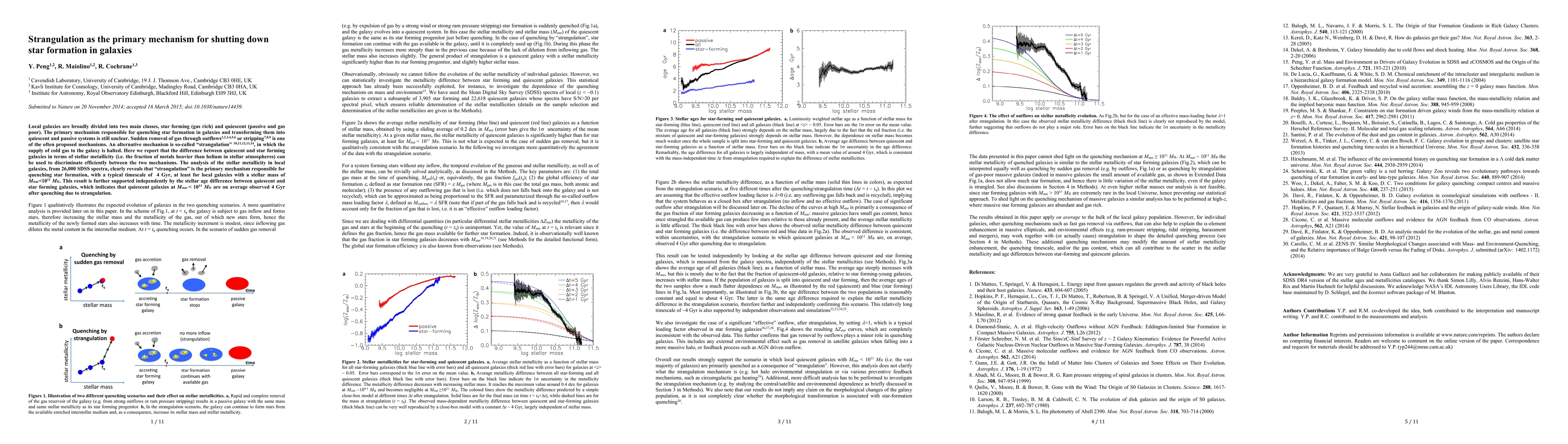 Local galaxies are broadly divided into two main classes, star-forming (gas-rich) and quiescent (passive and gas-poor). The primary mechanism responsible for quenching star formation in galaxies and transforming them into quiescent and passive systems is still unclear. Sudden removal of gas through outflows or stripping is one of the mechanisms often proposed. An alternative mechanism is so-called "strangulation", in which the supply of cold gas to the galaxy is halted. Here we report that the difference between quiescent and star forming galaxies in terms of stellar metallicity (i.e. the fraction of metals heavier than helium in stellar atmospheres) can be used to discriminate efficiently between the two mechanisms. The analysis of the stellar metallicity in local galaxies, from 26,000 spectra, clearly reveals that strangulation is the primary mechanism responsible for quenching star formation, with a typical timescale of 4 billion years, at least for local galaxies with a stellar mass less than 10^11 solar masses. This result is further supported independently by the stellar age difference between quiescent and star-forming galaxies, which indicates that quiescent galaxies of less than 10^11 solar masses are on average observed four billion years after quenching due to strangulation.