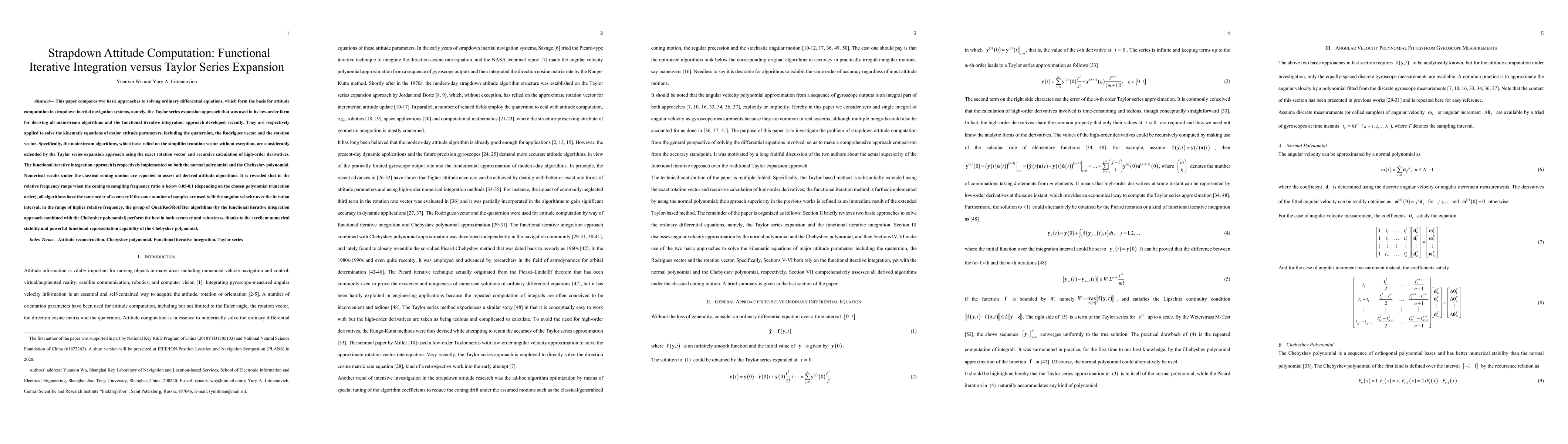 Researchers compare two methods for solving attitude equations in strapdown inertial navigation systems, finding that a new approach with Chebyshev polynomials performs best in accuracy and robustness at higher relative frequencies.