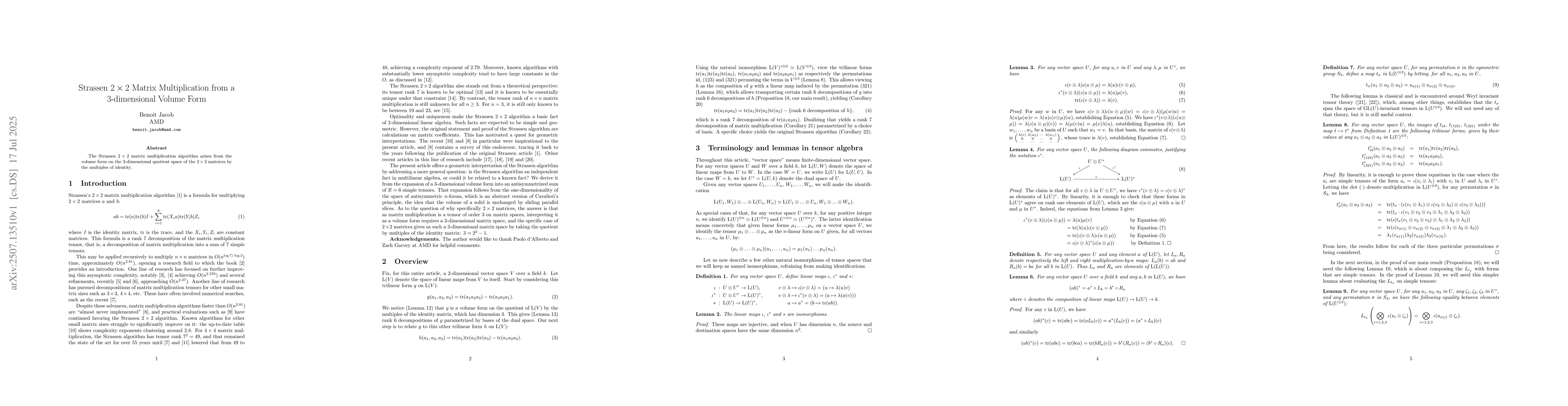 The Strassen $2\times2$ matrix multiplication algorithm arises from the volume form on the 3-dimensional quotient space of the $2\times 2$ matrices by the multiples of identity.