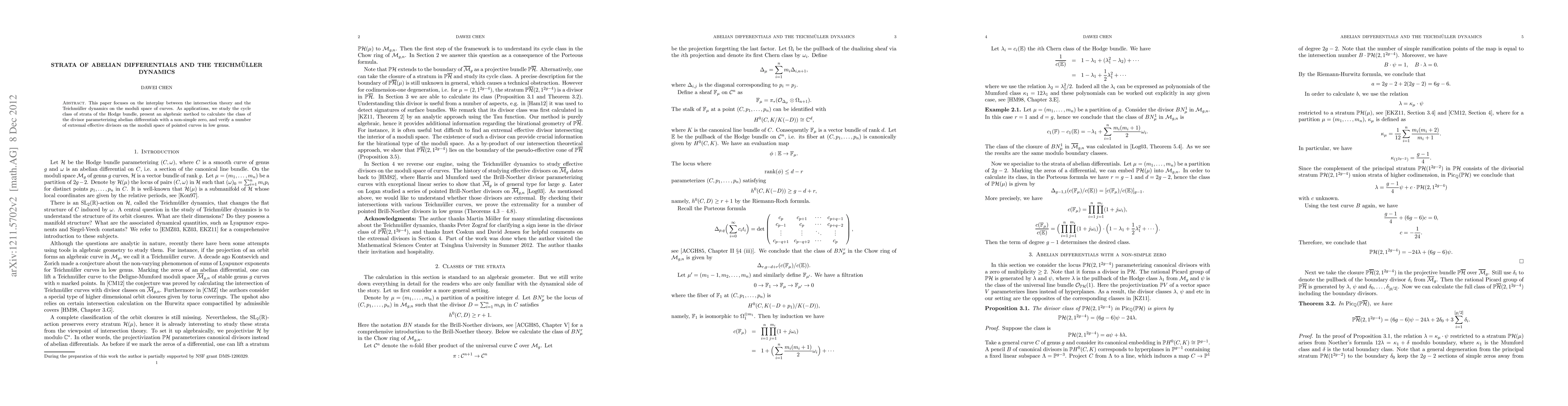 This research contributes to understanding the geometry of moduli spaces by providing explicit calculations and insights into the intersection theory and Teichmüller dynamics, which are crucial for studying abelian differentials and their strata.