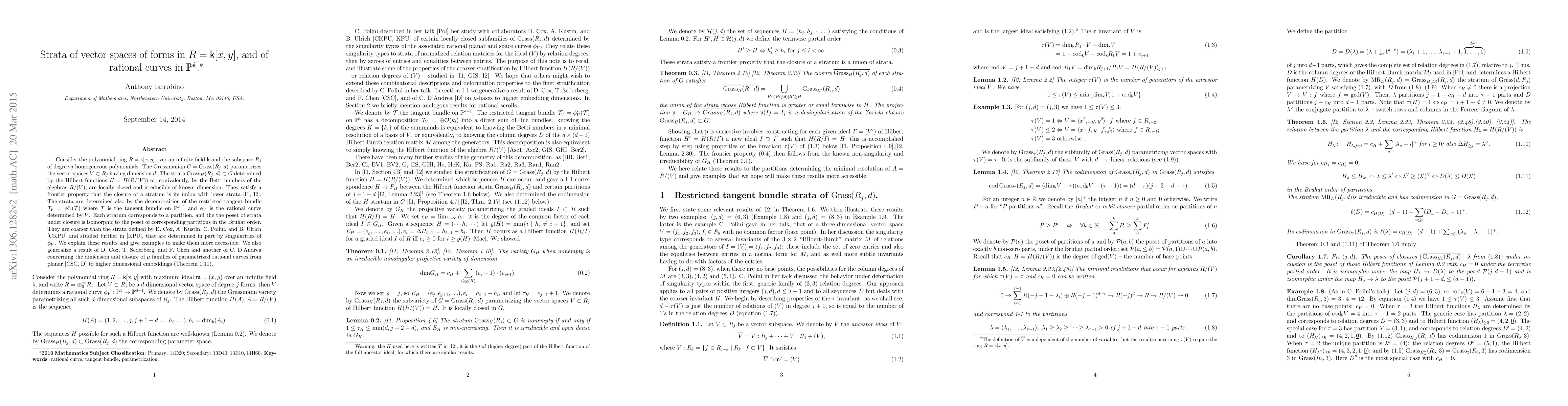 Consider the polynomial ring R=k[x,y] over an infinite field k and the subspace R_j of degree-j homogeneous polynomials. The Grassmanian G=Grass (R_j,d) parametrizes the vector spaces V in R_j having dimension d. The strata Grass_H(R_j,d) in G determined by the Hilbert function H=H(R/(V)) or, equivalently, by the Betti numbers of the algebra R/(V), are locally closed and irreducible of known dimension. We had previously shown also that they satisfy a frontier property that the closure of a stratum is its union with lower strata [I1,I2]. Each stratum corresponds to a partition, and the the poset of strata under closure is isomorphic to the poset of corresponding partitions in the Bruhat order. They are coarser than the strata defined by D. Cox, A. Kustin, C. Polini, and B.Ulrich [CKPU] recently that are determined in part by singularities of the rational curve determined by V. We explain these results and give examples to make them more accessible. We also generalize a result of D. Cox, T. Sederberg and F. Chen [CSC] and another of C. D'Andrea [D] concerning the dimension and closure of families of parametrized rational curves from planar to higher dimensional embeddings.