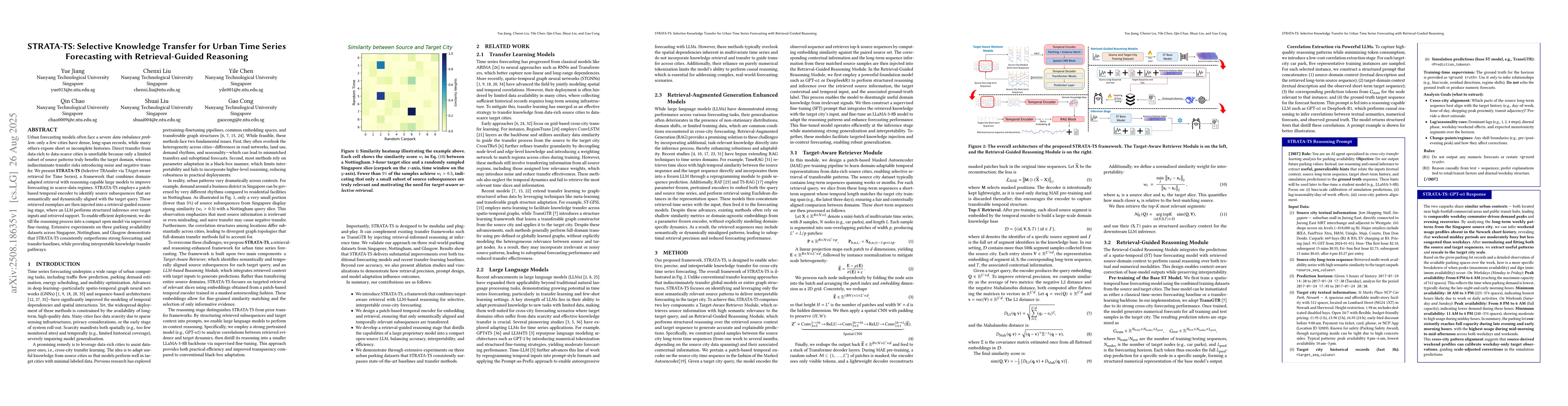 Urban forecasting models often face a severe data imbalance problem: only a few cities have dense, long-span records, while many others expose short or incomplete histories. Direct transfer from data-rich to data-scarce cities is unreliable because only a limited subset of source patterns truly benefits the target domain, whereas indiscriminate transfer risks introducing noise and negative transfer. We present STRATA-TS (Selective TRAnsfer via TArget-aware retrieval for Time Series), a framework that combines domain-adapted retrieval with reasoning-capable large models to improve forecasting in scarce data regimes. STRATA-TS employs a patch-based temporal encoder to identify source subsequences that are semantically and dynamically aligned with the target query. These retrieved exemplars are then injected into a retrieval-guided reasoning stage, where an LLM performs structured inference over target inputs and retrieved support. To enable efficient deployment, we distill the reasoning process into a compact open model via supervised fine-tuning. Extensive experiments on three parking availability datasets across Singapore, Nottingham, and Glasgow demonstrate that STRATA-TS consistently outperforms strong forecasting and transfer baselines, while providing interpretable knowledge transfer pathways.
