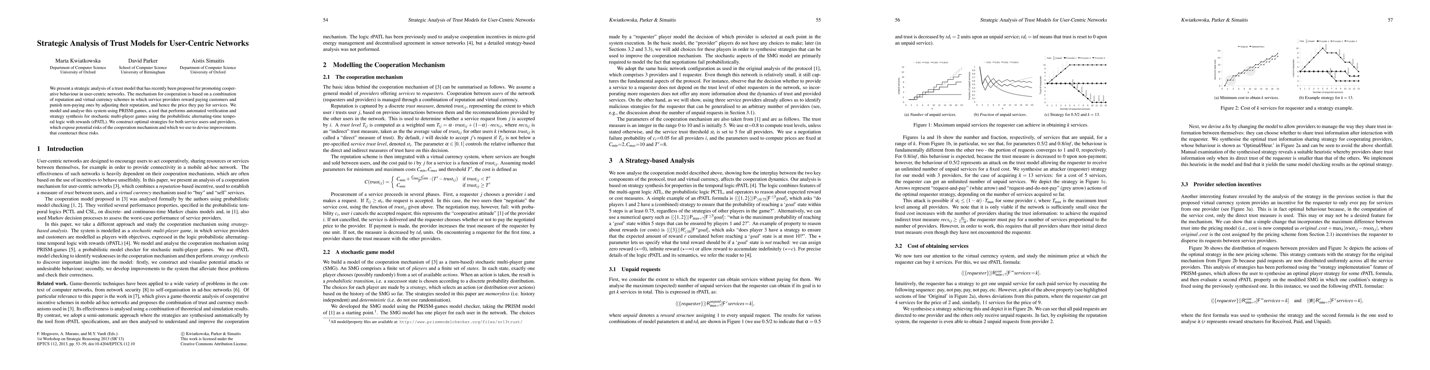 We present a strategic analysis of a trust model that has recently been proposed for promoting cooperative behaviour in user-centric networks. The mechanism for cooperation is based on a combination of reputation and virtual currency schemes in which service providers reward paying customers and punish non-paying ones by adjusting their reputation, and hence the price they pay for services. We model and analyse this system using PRISM-games, a tool that performs automated verification and strategy synthesis for stochastic multi-player games using the probabilistic alternating-time temporal logic with rewards (rPATL). We construct optimal strategies for both service users and providers, which expose potential risks of the cooperation mechanism and which we use to devise improvements that counteract these risks.