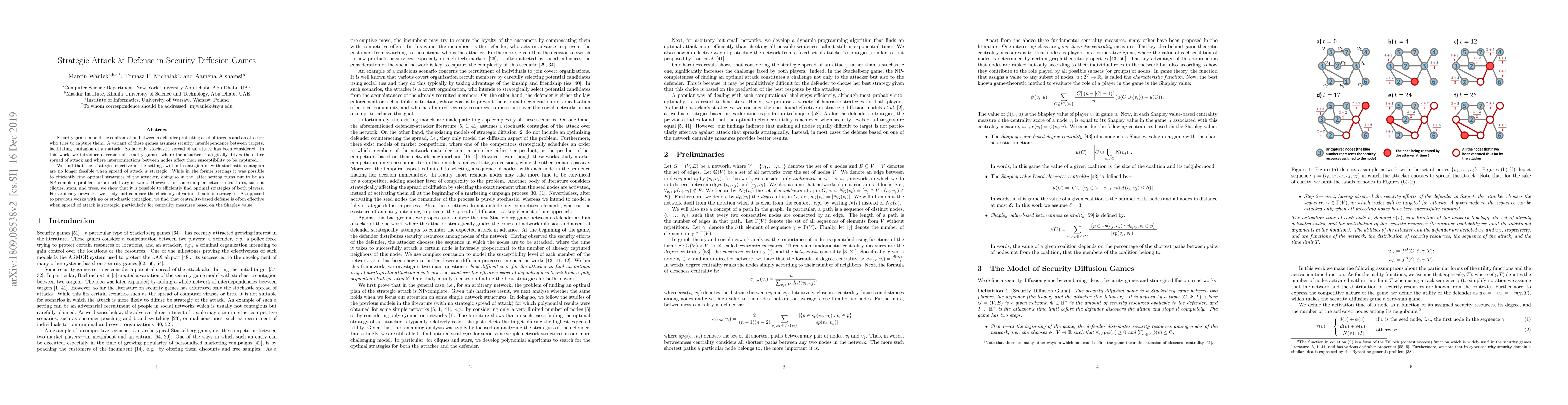 This paper explores strategic attack and defense in security diffusion games where the spread of attack is driven by the attacker, unlike stochastic spread. It finds that optimal strategies for both attacker and defender differ significantly when attack spread is strategic, becoming NP-complete for arbitrary networks, but solvable for simpler structures like cliques. Centrality-based defense, especially using Shapley value, proves effective in strategic contagion scenarios.