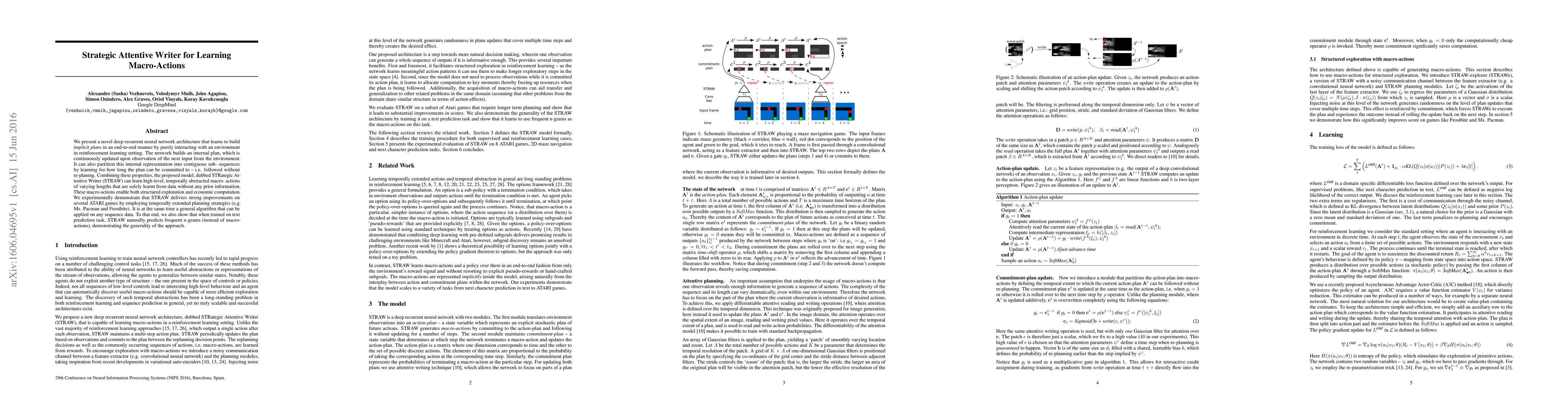 We present a novel deep recurrent neural network architecture that learns to build implicit plans in an end-to-end manner by purely interacting with an environment in reinforcement learning setting. The network builds an internal plan, which is continuously updated upon observation of the next input from the environment. It can also partition this internal representation into contiguous sub- sequences by learning for how long the plan can be committed to - i.e. followed without re-planing. Combining these properties, the proposed model, dubbed STRategic Attentive Writer (STRAW) can learn high-level, temporally abstracted macro- actions of varying lengths that are solely learnt from data without any prior information. These macro-actions enable both structured exploration and economic computation. We experimentally demonstrate that STRAW delivers strong improvements on several ATARI games by employing temporally extended planning strategies (e.g. Ms. Pacman and Frostbite). It is at the same time a general algorithm that can be applied on any sequence data. To that end, we also show that when trained on text prediction task, STRAW naturally predicts frequent n-grams (instead of macro-actions), demonstrating the generality of the approach.