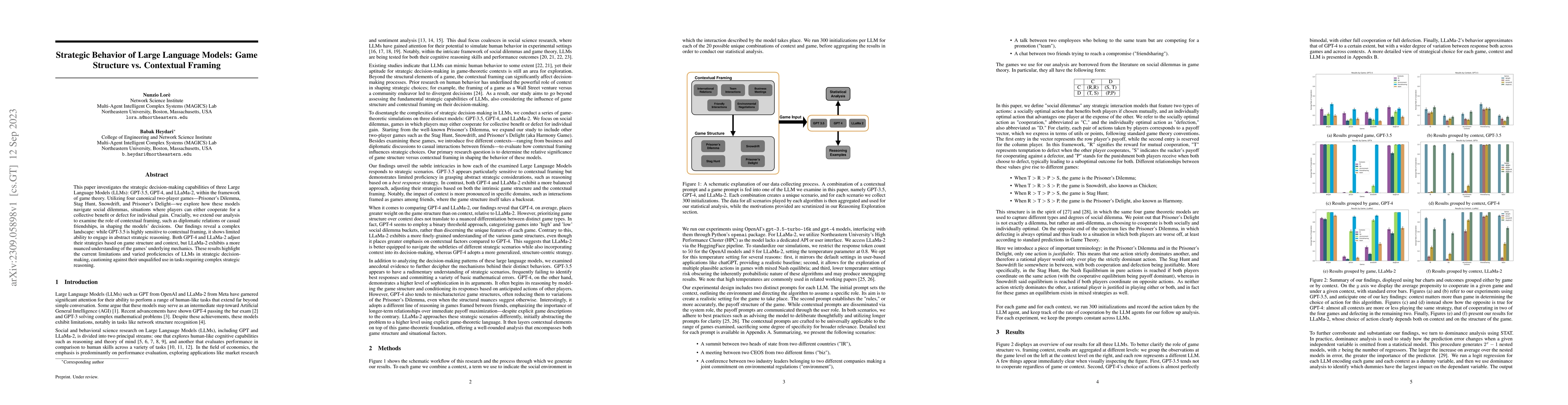 This paper examines the strategic behavior of LLMs in canonical two-player games, finding that while GPT-3.5 is context-sensitive but lacks abstract reasoning, GPT-4 and LLaMa-2 adapt strategies based on game structure and context, with LLaMa-2 showing a deeper understanding of game mechanics.