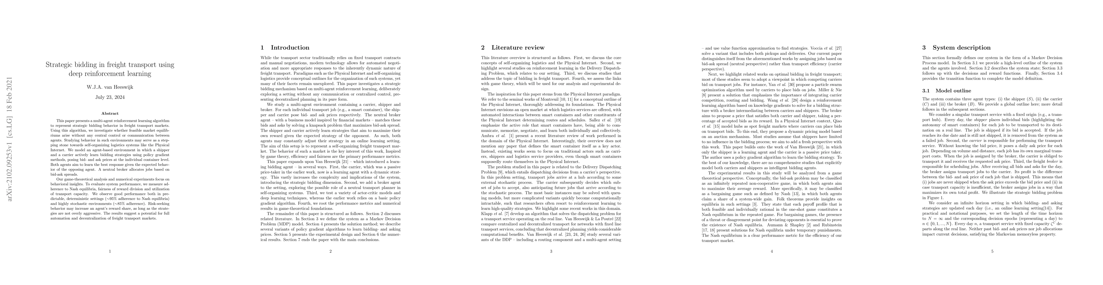 This paper employs deep reinforcement learning to model strategic bidding in freight transport, demonstrating that market equilibriums can emerge without central control. The study shows promising results in both deterministic and stochastic settings, suggesting potential for fully automated, decentralized logistics systems.