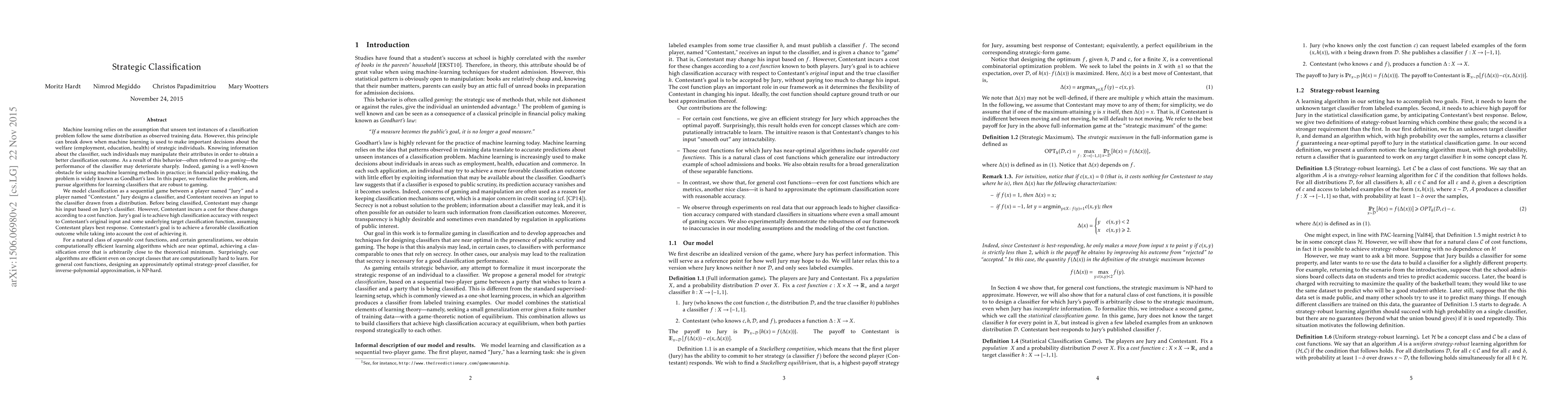 Machine learning relies on the assumption that unseen test instances of a classification problem follow the same distribution as observed training data. However, this principle can break down when machine learning is used to make important decisions about the welfare (employment, education, health) of strategic individuals. Knowing information about the classifier, such individuals may manipulate their attributes in order to obtain a better classification outcome. As a result of this behavior---often referred to as gaming---the performance of the classifier may deteriorate sharply. Indeed, gaming is a well-known obstacle for using machine learning methods in practice; in financial policy-making, the problem is widely known as Goodhart's law. In this paper, we formalize the problem, and pursue algorithms for learning classifiers that are robust to gaming. We model classification as a sequential game between a player named "Jury" and a player named "Contestant." Jury designs a classifier, and Contestant receives an input to the classifier, which he may change at some cost. Jury's goal is to achieve high classification accuracy with respect to Contestant's original input and some underlying target classification function. Contestant's goal is to achieve a favorable classification outcome while taking into account the cost of achieving it. For a natural class of cost functions, we obtain computationally efficient learning algorithms which are near-optimal. Surprisingly, our algorithms are efficient even on concept classes that are computationally hard to learn. For general cost functions, designing an approximately optimal strategy-proof classifier, for inverse-polynomial approximation, is NP-hard.