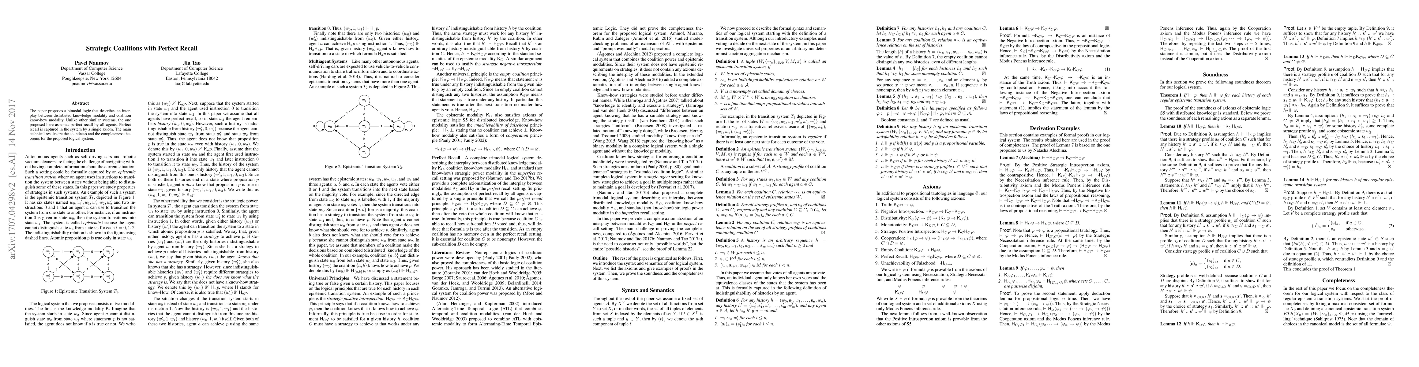 The paper proposes a bimodal logic that describes an interplay between distributed knowledge modality and coalition know-how modality. Unlike other similar systems, the one proposed here assumes perfect recall by all agents. Perfect recall is captured in the system by a single axiom. The main technical results are the soundness and the completeness theorems for the proposed logical system.