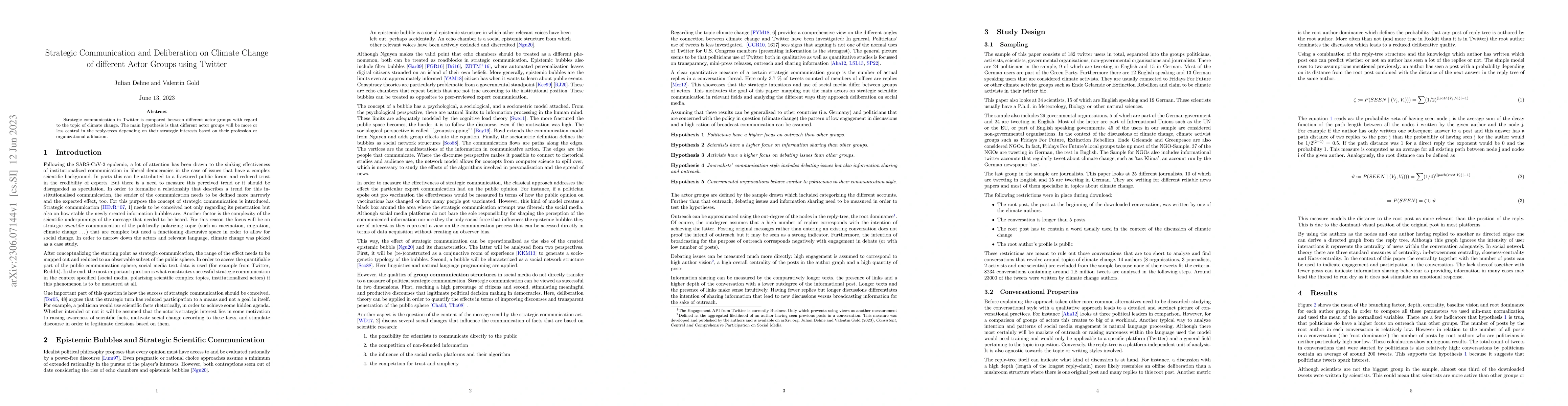 Strategic communication in Twitter is compared between different actor groups with regard to the topic of climate change. The main hypothesis is that different actor groups will be more or less central in the reply-trees depending on their strategic interests based on their profession or organizational affiliation.