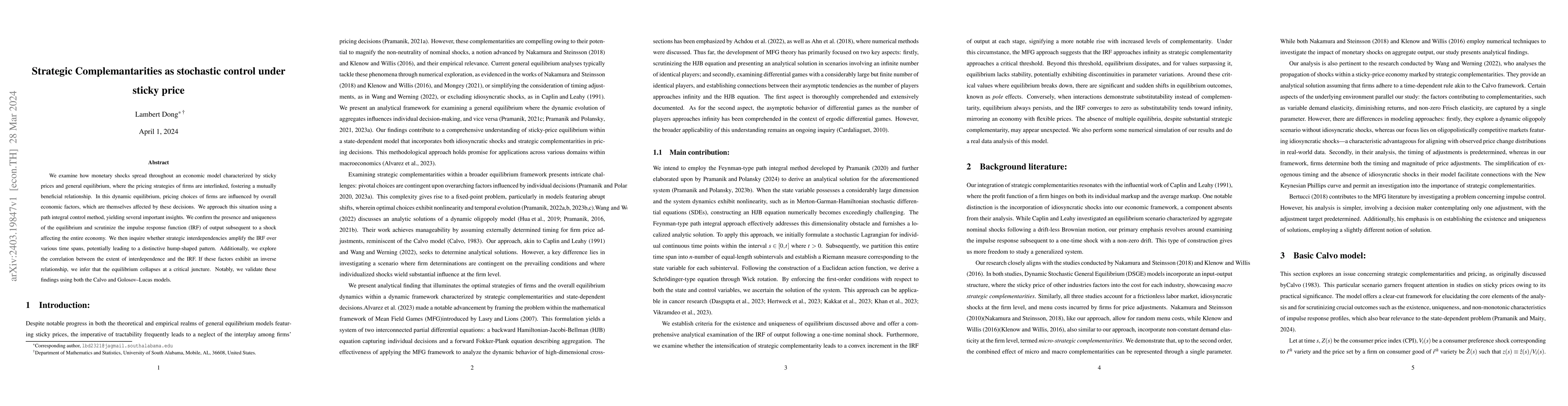 We examine how monetary shocks spread throughout an economic model characterized by sticky prices and general equilibrium, where the pricing strategies of firms are interlinked, fostering a mutually beneficial relationship. In this dynamic equilibrium, pricing choices of firms are influenced by overall economic factors, which are themselves affected by these decisions. We approach this situation using a path integral control method, yielding several important insights. We confirm the presence and uniqueness of the equilibrium and scrutinize the impulse response function (IRF) of output subsequent to a shock affecting the entire economy.