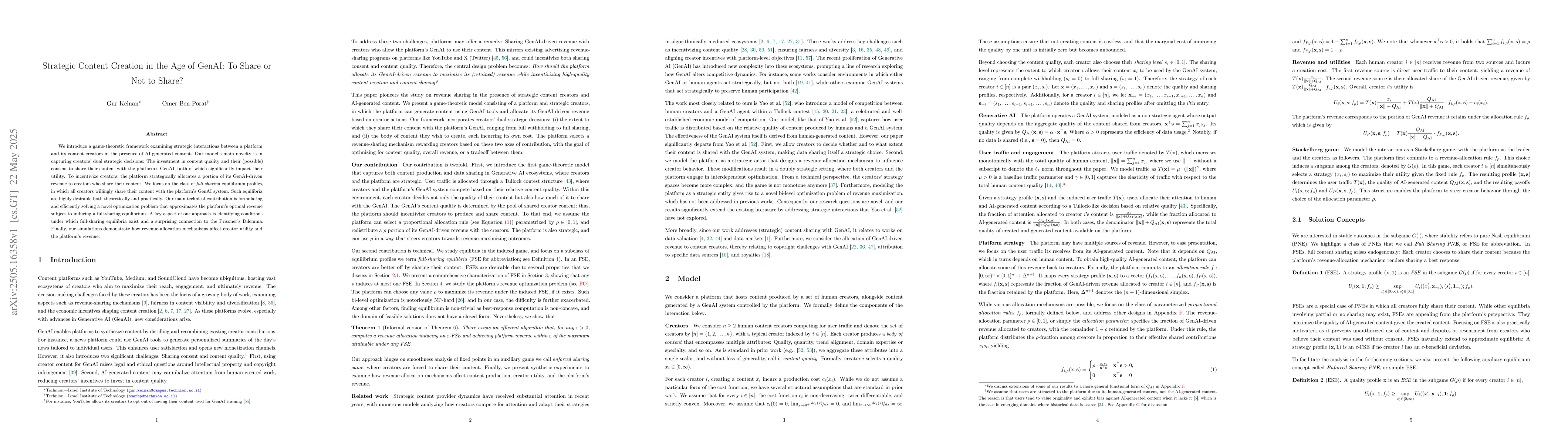 A new game-theoretic framework examines how platforms balance their own revenue with creators' incentives to share AI-generated content. It finds conditions for full-sharing equilibrium profiles, where creators willingly share their content.