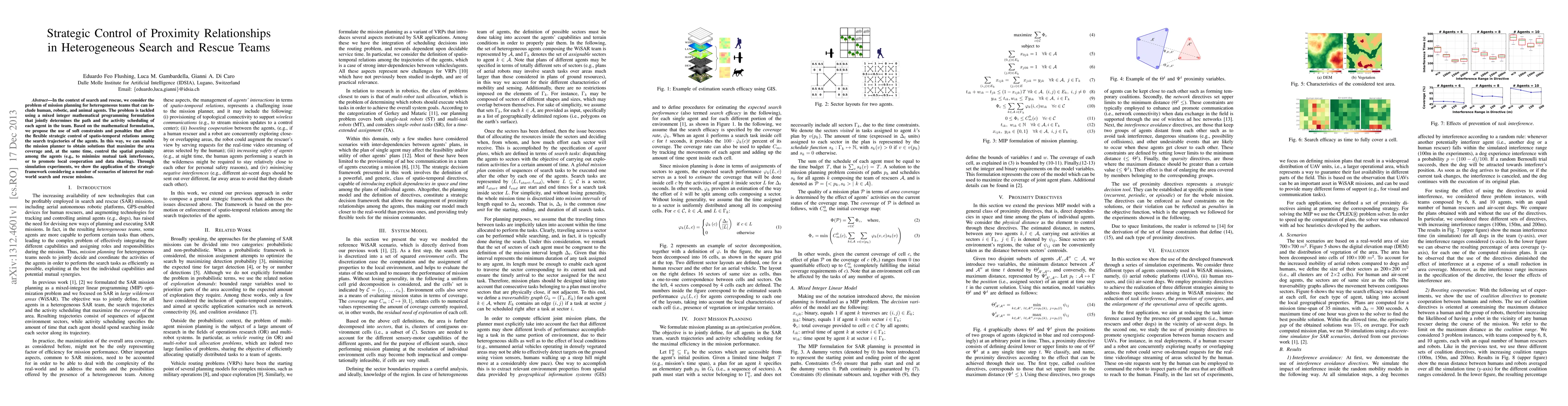In the context of search and rescue, we consider the problem of mission planning for heterogeneous teams that can include human, robotic, and animal agents. The problem is tackled using a mixed integer mathematical programming formulation that jointly determines the path and the activity scheduling of each agent in the team. Based on the mathematical formulation, we propose the use of soft constraints and penalties that allow the flexible strategic control of spatio-temporal relations among the search trajectories of the agents. In this way, we can enable the mission planner to obtain solutions that maximize the area coverage and, at the same time, control the spatial proximity among the agents (e.g., to minimize mutual task interference, or to promote local cooperation and data sharing). Through simulation experiments, we show the application of the strategic framework considering a number of scenarios of interest for real-world search and rescue missions.