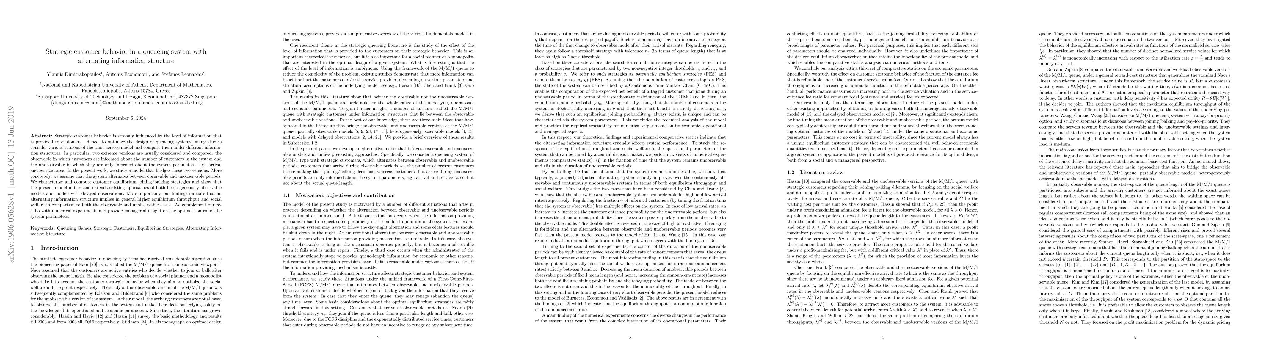 This paper explores strategic customer behavior in queueing systems under an alternating information structure, where periods of full observability alternate with periods of limited observability. The study reveals that such a structure generally leads to higher equilibrium throughput and social welfare compared to fully observable or unobservable systems, offering valuable managerial insights for system parameter control.