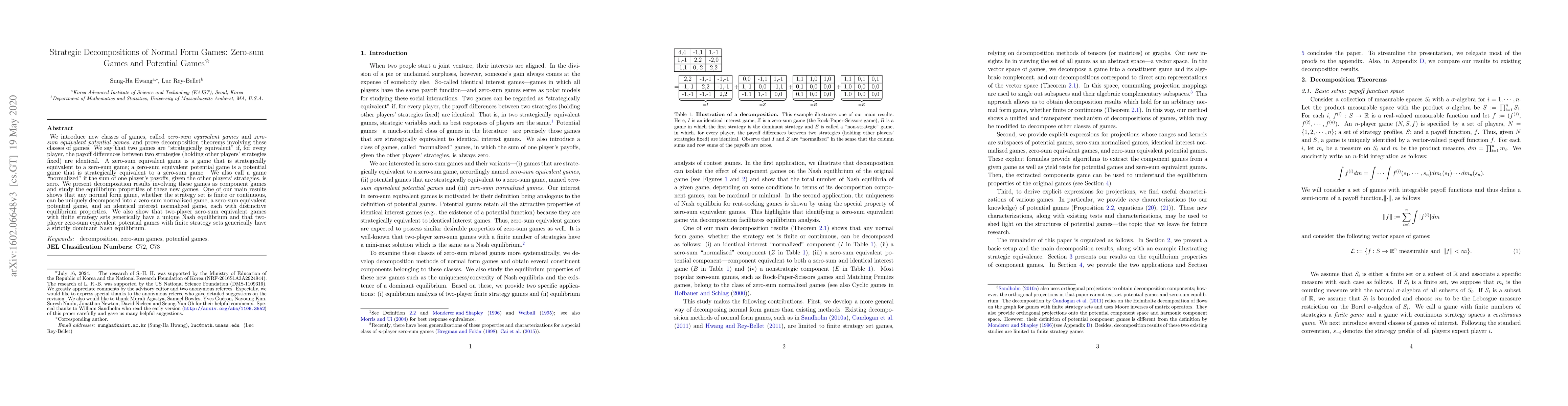 We study new classes of games, called zero-sum equivalent games and zero-sum equivalent potential games, and prove decomposition theorems involving these classes of games. We say that two games are "strategically equivalent" if, for every player, the payoff differences between two strategies (holding other players' strategies fixed) are identical. A zero-sum equivalent game is a game that is strategically equivalent to a zero-sum game; a zero-sum equivalent potential game is a zero-sum equivalent game that is strategically equivalent to a common interest game. We also call a game "normalized" if the sum of one player's payoffs, given the other players' strategies, is always zero. We show that any normal form game can be uniquely decomposed into either (i) a zero-sum equivalent game and a normalized common interest game, or (ii) a zero-sum equivalent potential game, a normalized zero-sum game, and a normalized common interest game, each with distinctive equilibrium properties. For example, we show that two-player zero-sum equivalent games with finite strategy sets generically have a unique Nash equilibrium and that two-player zero-sum equivalent potential games with finite strategy sets generically have a strictly dominant Nash equilibrium.