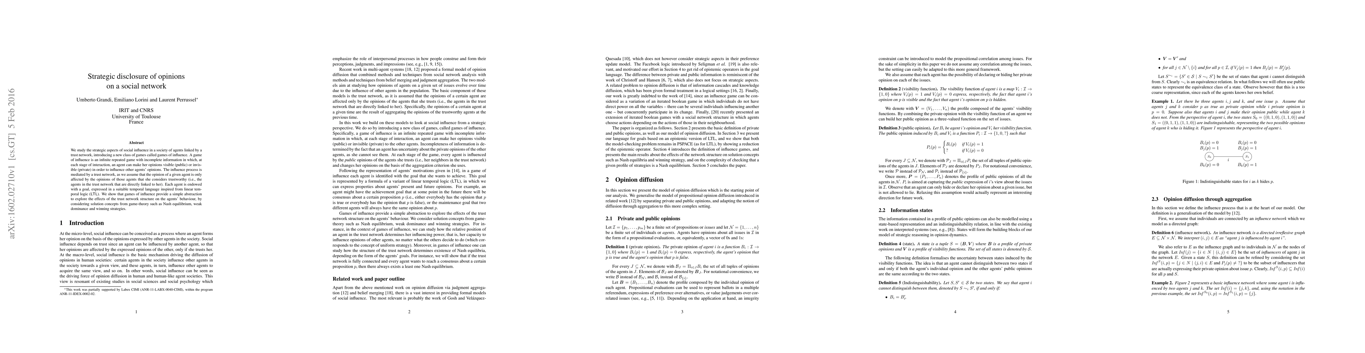 This paper explores strategic opinion disclosure in social networks through a new class of games called games of influence, where agents can choose to reveal or hide their opinions to influence others based on a trust network. The study examines how trust network structure impacts agent behavior using game-theory concepts like Nash equilibrium and winning strategies.