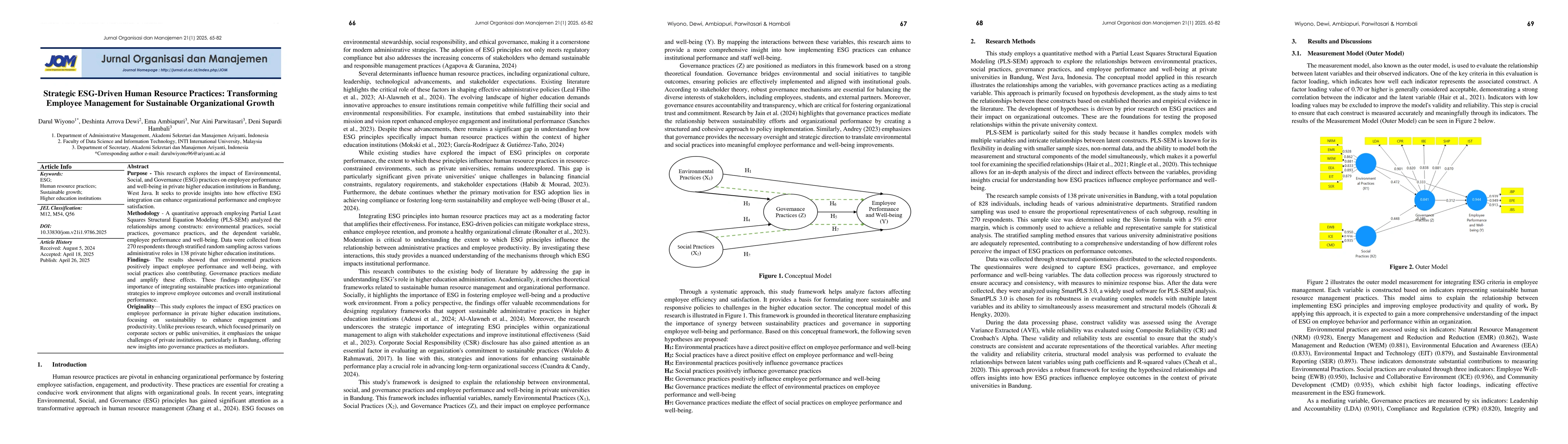 Purpose: This research explores the impact of Environmental, Social, and Governance (ESG) practices on employee performance and well-being in private higher education institutions in Bandung, West Java. It seeks to provide insights into how effective ESG integration can enhance organizational performance and employee satisfaction. Methodology: A quantitative approach employing Partial Least Squares Structural Equation Modeling (PLS-SEM) analyzed the relationships among constructs: environmental practices, social practices, governance practices, and the dependent variable, employee performance and well-being. Data were collected from 270 respondents through stratified random sampling across various administrative roles in 138 private higher education institutions. Findings: The results showed that environmental practices positively impact employee performance and well-being, with social practices also contributing. Governance practices mediate and amplify these effects. These findings emphasize the importance of integrating sustainable practices into organizational strategies to improve employee outcomes and overall institutional performance. Originality: This study explores the impact of ESG practices on employee performance in private higher education institutions, focusing on sustainability to enhance engagement and productivity. Unlike previous research, which focused primarily on corporate sectors or public universities, it emphasizes the unique challenges of private institutions, particularly in Bandung, offering new insights into governance practices as mediators.