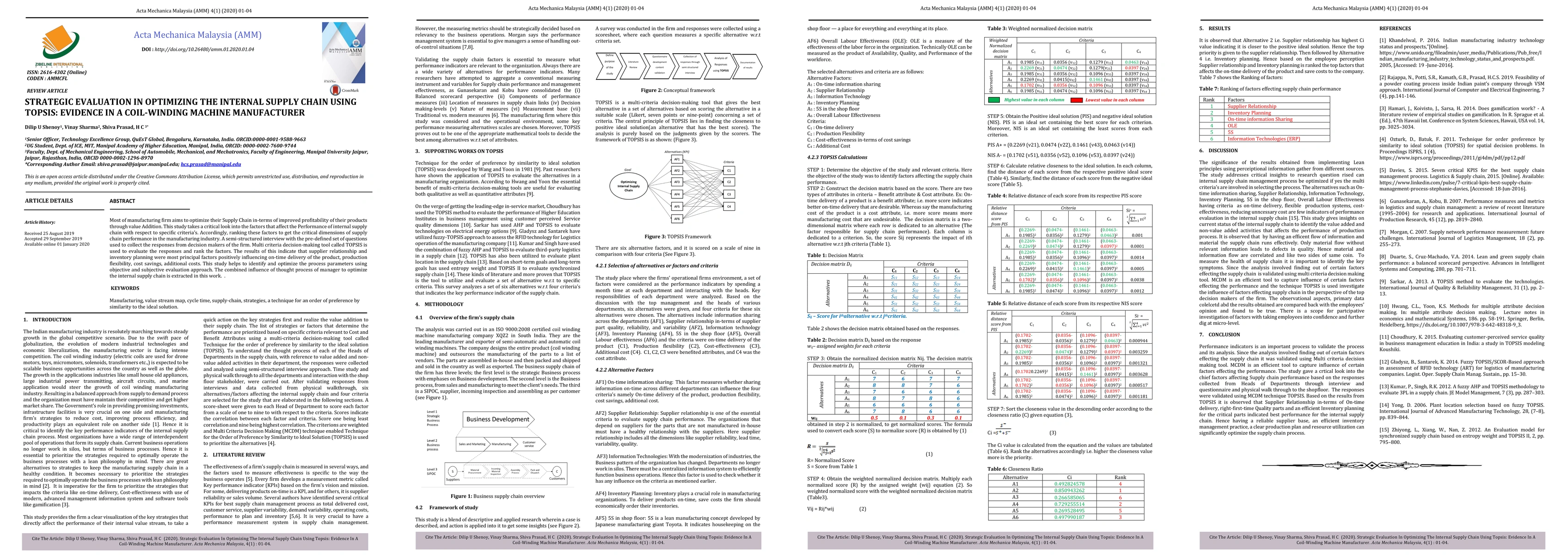This study uses TOPSIS to evaluate internal supply chain performance in a coil winding machine manufacturer, identifying supplier relationship and inventory planning as key factors influencing on-time delivery and cost savings. The research provides an objective approach to optimizing the internal supply chain process parameters.