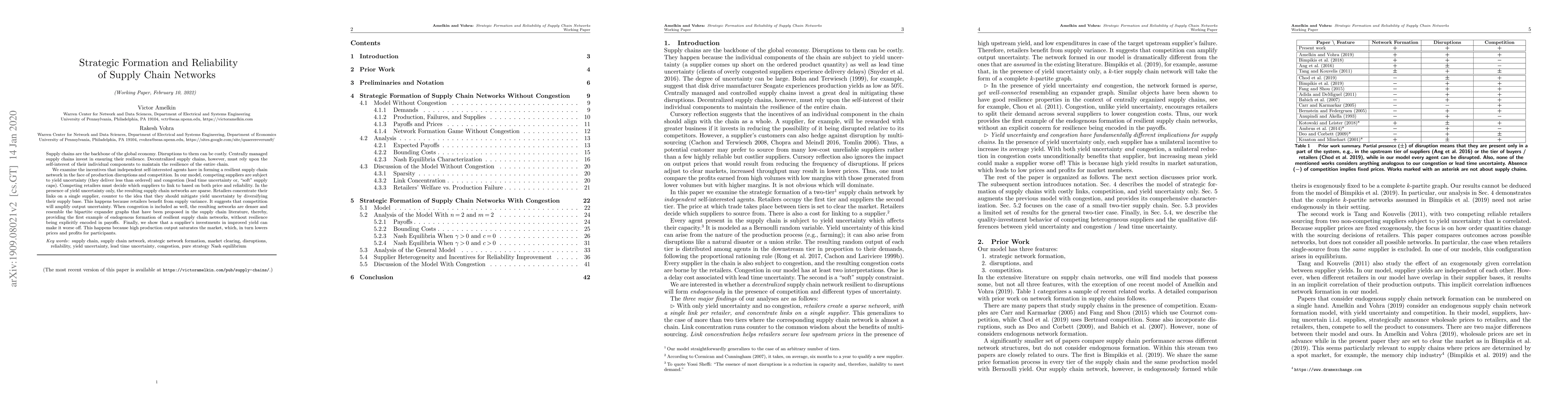 This paper explores how decentralized supply chains form resilient networks through self-interested agents facing production disruptions and competition. It finds that while yield uncertainty leads to sparse networks, congestion results in denser, more resilient networks, challenging the notion of diversification for risk mitigation.