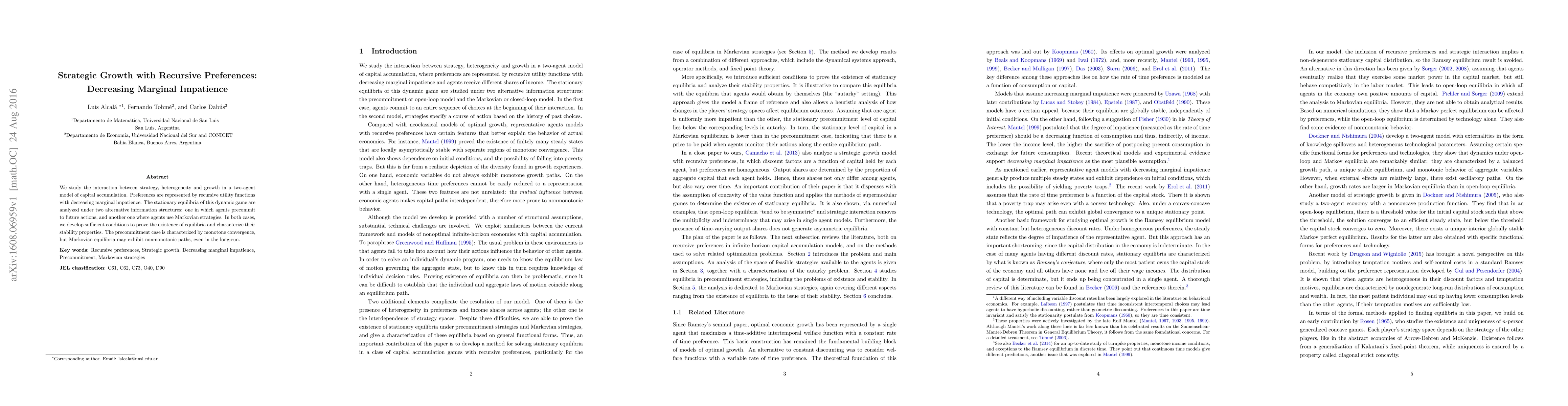 We study the interaction between strategy, heterogeneity and growth in a two-agent model of capital accumulation. Preferences are represented by recursive utility functions with decreasing marginal impatience. The stationary equilibria of this dynamic game are analyzed under two alternative information structures: one in which agents precommit to future actions, and another one where agents use Markovian strategies. In both cases, we develop sufficient conditions to prove the existence of equilibria and characterize their stability properties. The precommitment case is characterized by monotone convergence, but Markovian equilibria may exhibit nonmonotonic paths, even in the long-run.