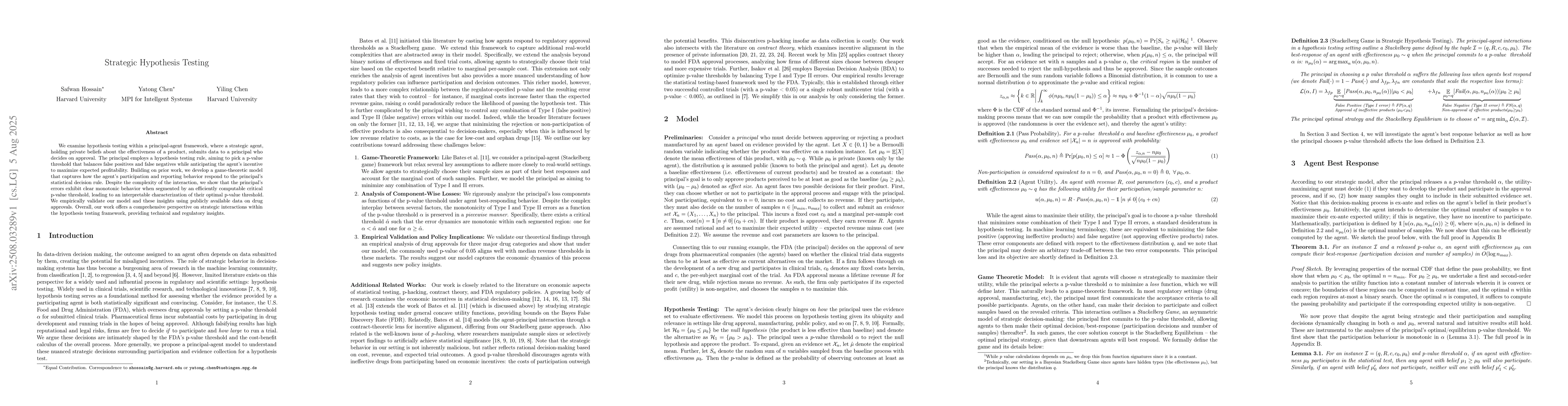 We examine hypothesis testing within a principal-agent framework, where a strategic agent, holding private beliefs about the effectiveness of a product, submits data to a principal who decides on approval. The principal employs a hypothesis testing rule, aiming to pick a p-value threshold that balances false positives and false negatives while anticipating the agent's incentive to maximize expected profitability. Building on prior work, we develop a game-theoretic model that captures how the agent's participation and reporting behavior respond to the principal's statistical decision rule. Despite the complexity of the interaction, we show that the principal's errors exhibit clear monotonic behavior when segmented by an efficiently computable critical p-value threshold, leading to an interpretable characterization of their optimal p-value threshold. We empirically validate our model and these insights using publicly available data on drug approvals. Overall, our work offers a comprehensive perspective on strategic interactions within the hypothesis testing framework, providing technical and regulatory insights.