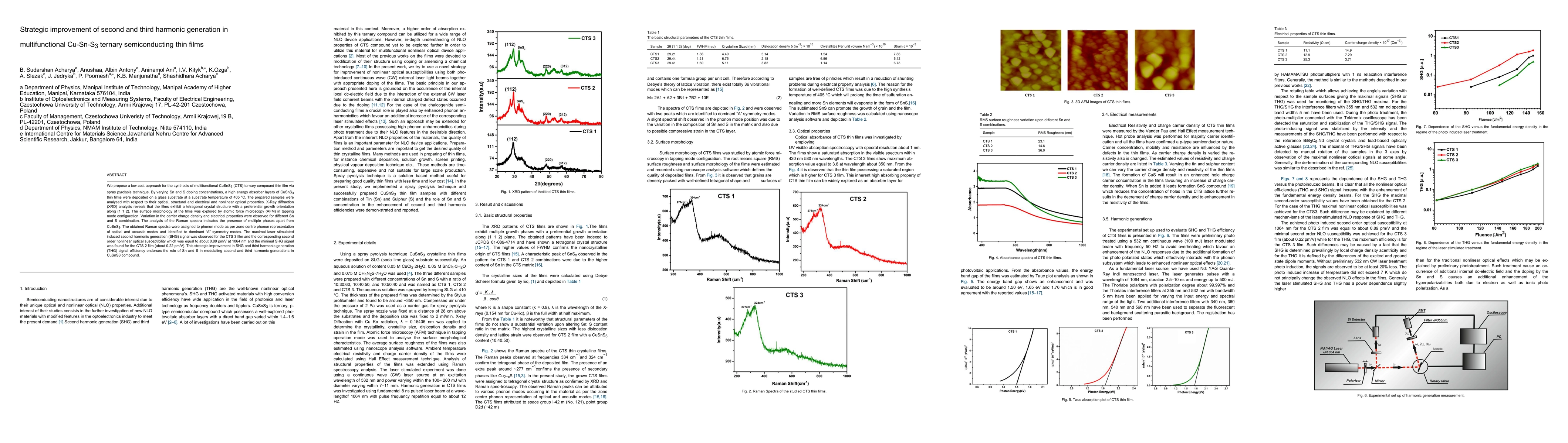 We propose a low-cost approach for the synthesis of multifunctional CuSnS3 (CTS) ternary compound thin film via spray pyrolysis technique. By varying Sn and S doping concentrations, a high energy absorber layers of CuSnS3 thin films were deposited on a glass substrate at a substrate temperature of 405 C. The prepared samples were analysed with respect to their optical, structural and electrical and nonlinear optical properties. X-Ray diffraction (XRD) analysis reveals that the films exhibit a tetragonal crystal structure with a preferential growth orientation along (1 1 2). The surface morphology of the films was explored by atomic force microscopy (AFM) in tapping mode configuration. Variation in the carrier charge density and electrical properties were observed for different Sn and S combination. The analysis of the Raman spectra indicates the presence of multiple phases apart from CuSnS3. The obtained Raman spectra were assigned to phonon mode as per zone centre phonon representation of optical and acoustic modes and identified to dominant A symmetry modes. The maximal laser stimulated induced second harmonic generation (SHG) signal was observed for the CTS 3 film and the corresponding second order nonlinear optical susceptibility which was equal to about 0.89 pm/V at 1064 nm and the minimal SHG signal was found for the CTS 2 film (about 0.22 pm/V). This strategic improvement in SHG and third harmonic generation (THG) signal efficiency endorses the role of Sn and S in modulating second and third harmonic generations in CuSnS3 compound.