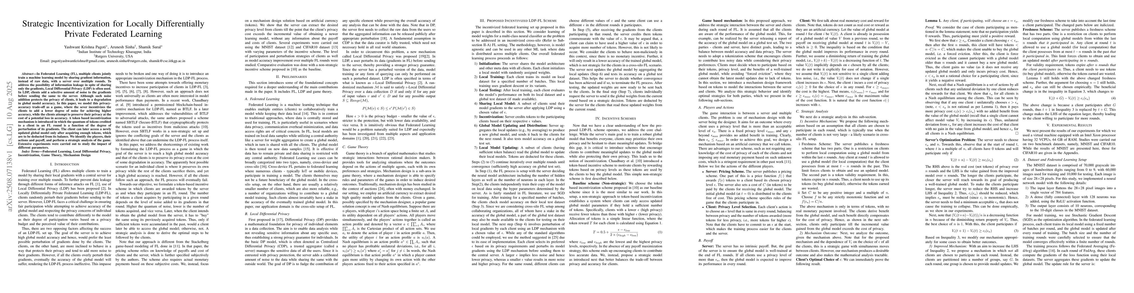 This work stands out by applying game theory to model strategic interactions between clients and the server in LDP-FL systems, proposing an innovative token-based incentive mechanism that addresses the privacy-accuracy trade-off while ensuring high-quality model updates.
