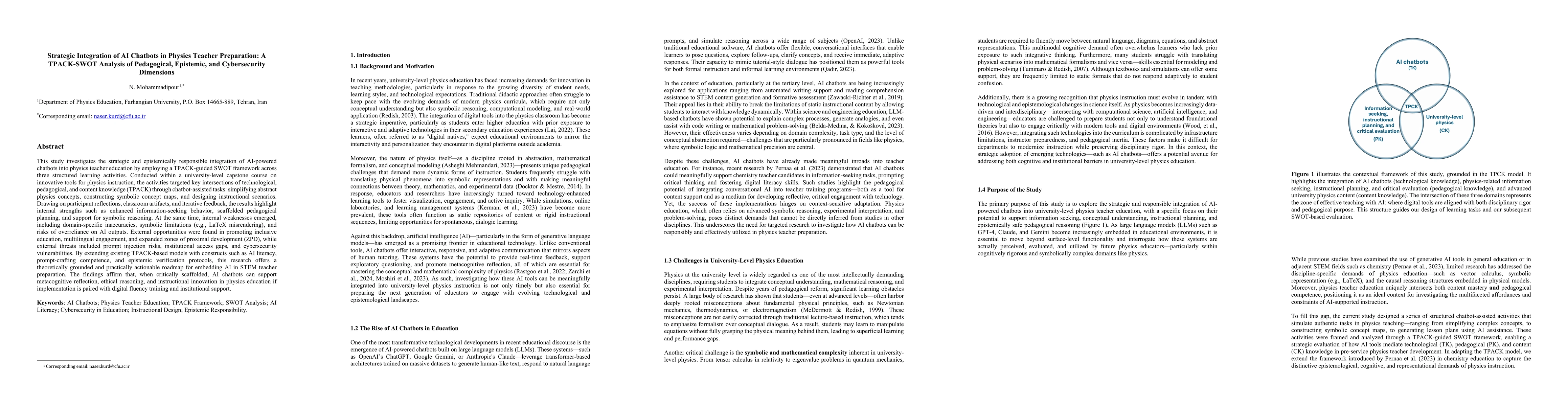 This study investigates the strategic and epistemically responsible integration of AI-powered chatbots into physics teacher education by employing a TPACK-guided SWOT framework across three structured learning activities. Conducted within a university-level capstone course on innovative tools for physics instruction, the activities targeted key intersections of technological, pedagogical, and content knowledge (TPACK) through chatbot-assisted tasks: simplifying abstract physics concepts, constructing symbolic concept maps, and designing instructional scenarios. Drawing on participant reflections, classroom artifacts, and iterative feedback, the results highlight internal strengths such as enhanced information-seeking behavior, scaffolded pedagogical planning, and support for symbolic reasoning. At the same time, internal weaknesses emerged, including domain-specific inaccuracies, symbolic limitations (e.g., LaTeX misrendering), and risks of overreliance on AI outputs. External opportunities were found in promoting inclusive education, multilingual engagement, and expanded zones of proximal development (ZPD), while external threats included prompt injection risks, institutional access gaps, and cybersecurity vulnerabilities. By extending existing TPACK-based models with constructs such as AI literacy, prompt-crafting competence, and epistemic verification protocols, this research offers a theoretically grounded and practically actionable roadmap for embedding AI in STEM teacher preparation. The findings affirm that, when critically scaffolded, AI chatbots can support metacognitive reflection, ethical reasoning, and instructional innovation in physics education if implementation is paired with digital fluency training and institutional support.