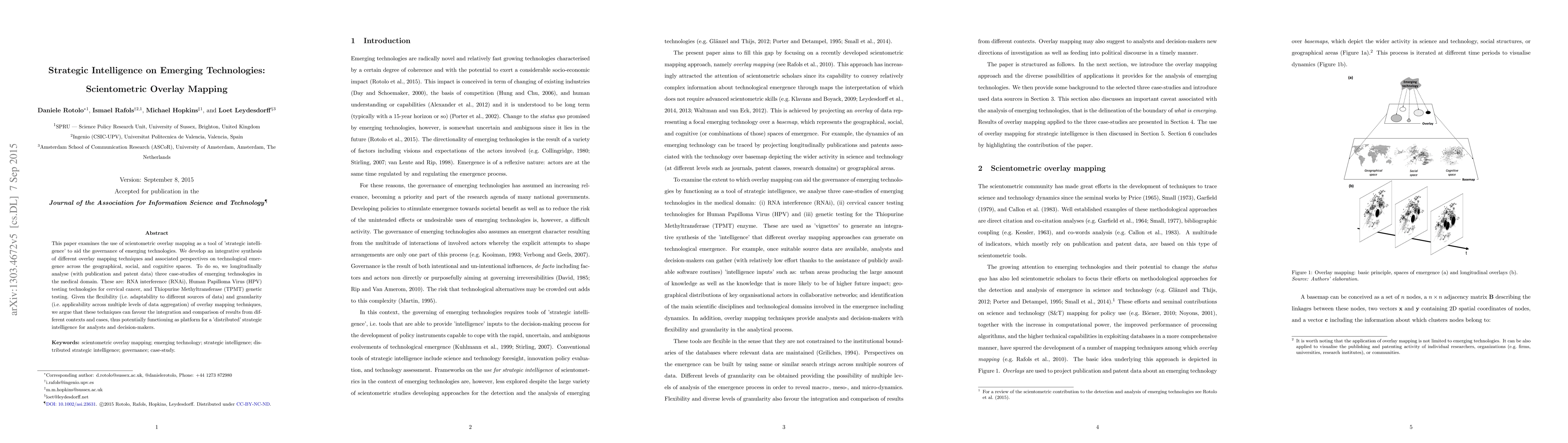 This paper explores scientometric overlay mapping as a strategic intelligence tool for governing emerging technologies, integrating various mapping techniques to analyze three medical technologies longitudinally. It argues that these techniques can facilitate the comparison and integration of diverse data, serving as a platform for distributed strategic intelligence.