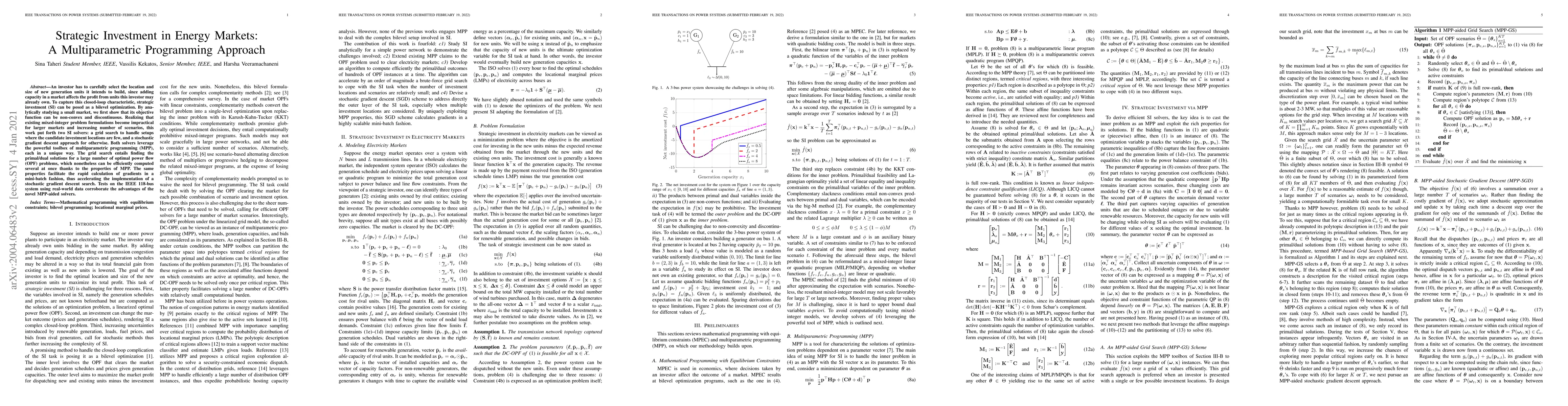 This paper proposes strategic investment in energy markets as a bilevel optimization problem, demonstrating non-convexity and discontinuity in small markets. It introduces two solvers: a grid search for limited candidate locations and a stochastic gradient descent for larger markets, both utilizing multiparametric programming to efficiently compute optimal power flows and gradients.
