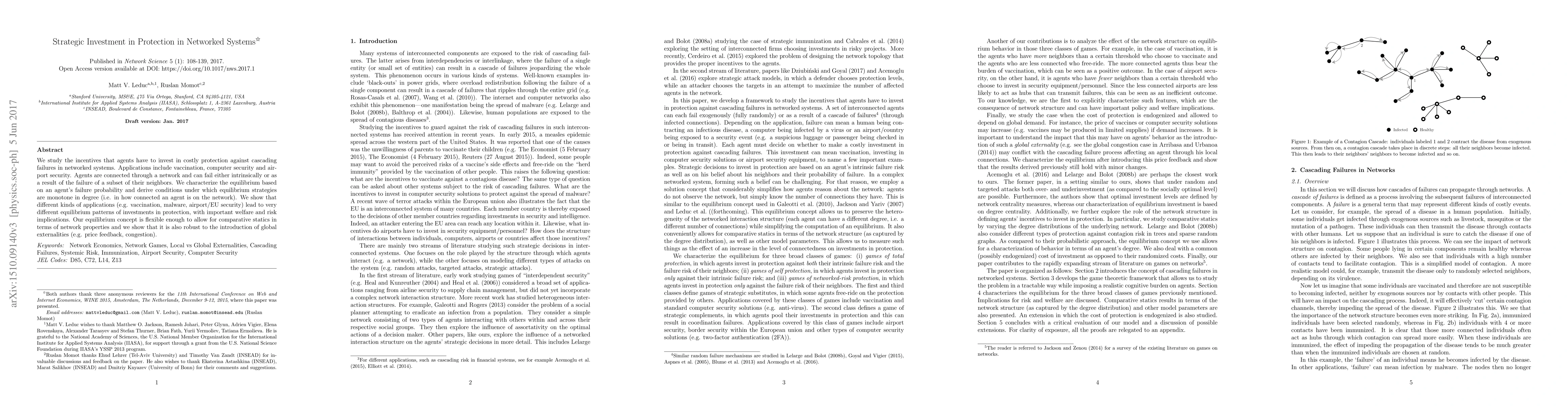 A research paper studies incentives for agents to invest in protection against cascading failures in networked systems, finding different equilibrium patterns for various applications with varying welfare and risk implications.