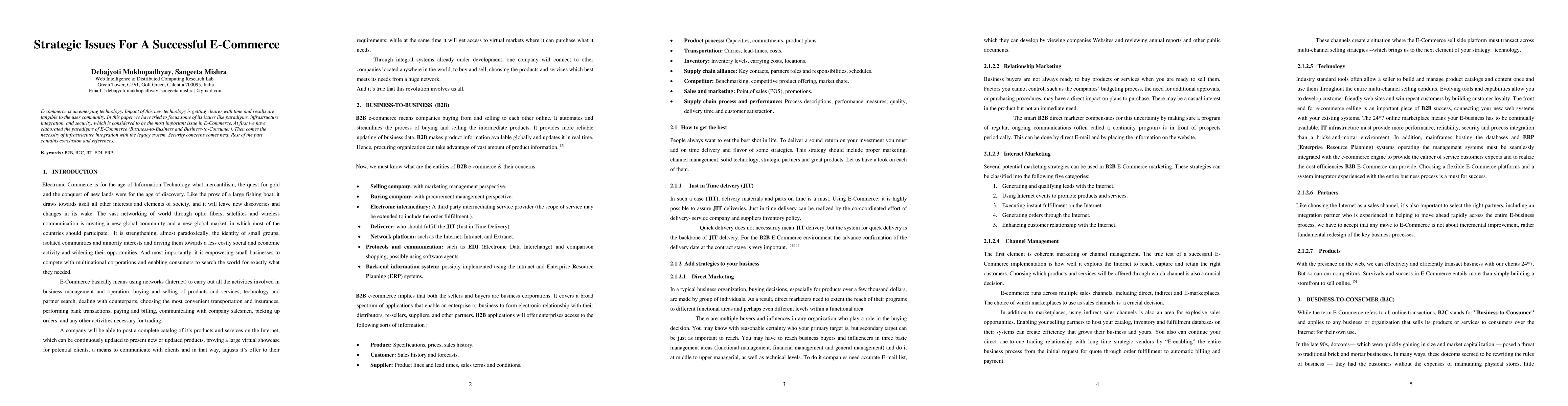 This paper explores strategic issues in e-commerce, focusing on paradigms (Business-to-Business and Business-to-Consumer), the integration of e-commerce infrastructure with legacy systems, and the paramount importance of security concerns. The paper concludes with a summary and references.
