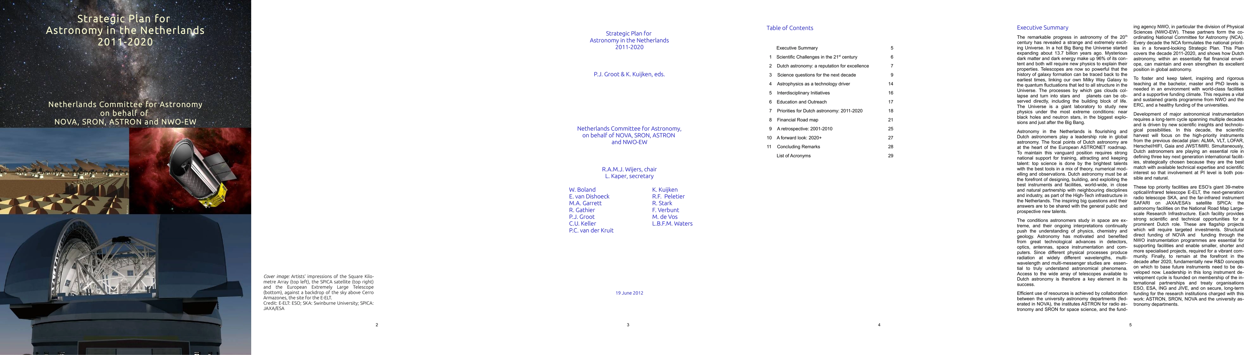 The Netherlands Committee for Astronomy's Strategic Plan for 2011-2020 outlines scientific priorities, required instrumentation, and financial needs for Dutch astronomy, while also emphasizing the role of technology development and education outreach. It reviews past achievements and projects future directions beyond 2020.