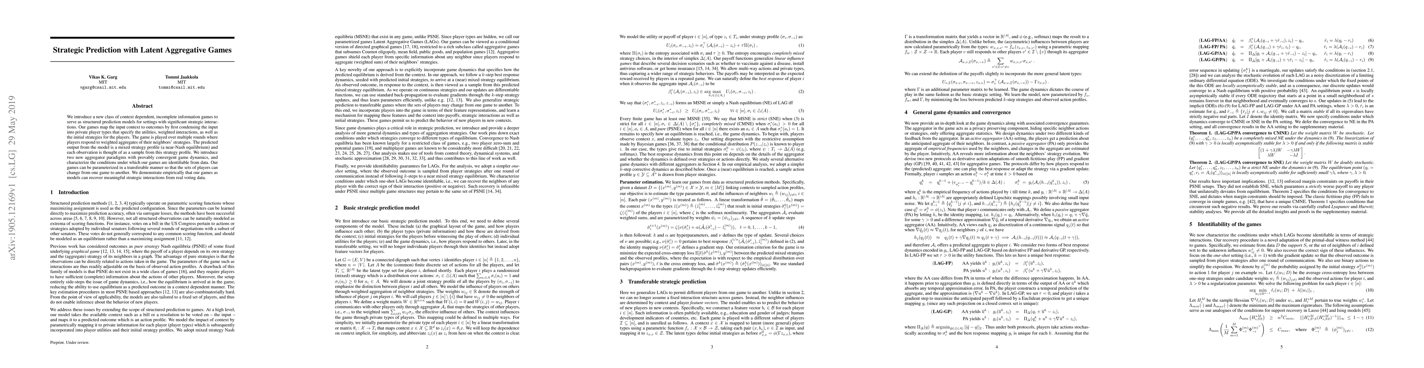 This paper introduces a new class of strategic prediction models based on latent aggregative games, which condense input context into player types and predict outcomes through multiple rounds of weighted interactions. The proposed games achieve near-Nash equilibria and are shown to recover strategic interactions from real voting data.