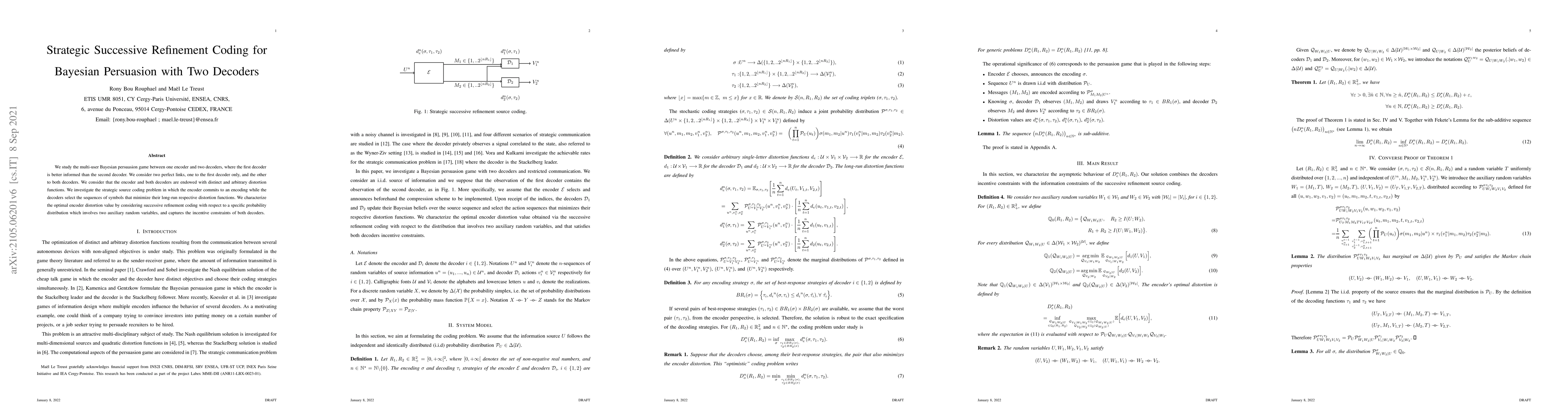 We study the multi-user Bayesian persuasion game between one encoder and two decoders, where the first decoder is better informed than the second decoder. We consider two perfect links, one to the first decoder only, and the other to both decoders. We consider that the encoder and both decoders are endowed with distinct and arbitrary distortion functions. We investigate the strategic source coding problem in which the encoder commits to an encoding while the decoders select the sequences of symbols that minimize their respective distortion functions. We characterize the optimal encoder distortion value by considering successive refinement coding with respect to a specific probability distribution which involves two auxiliary random variables, and captures the incentives constraints of both decoders.