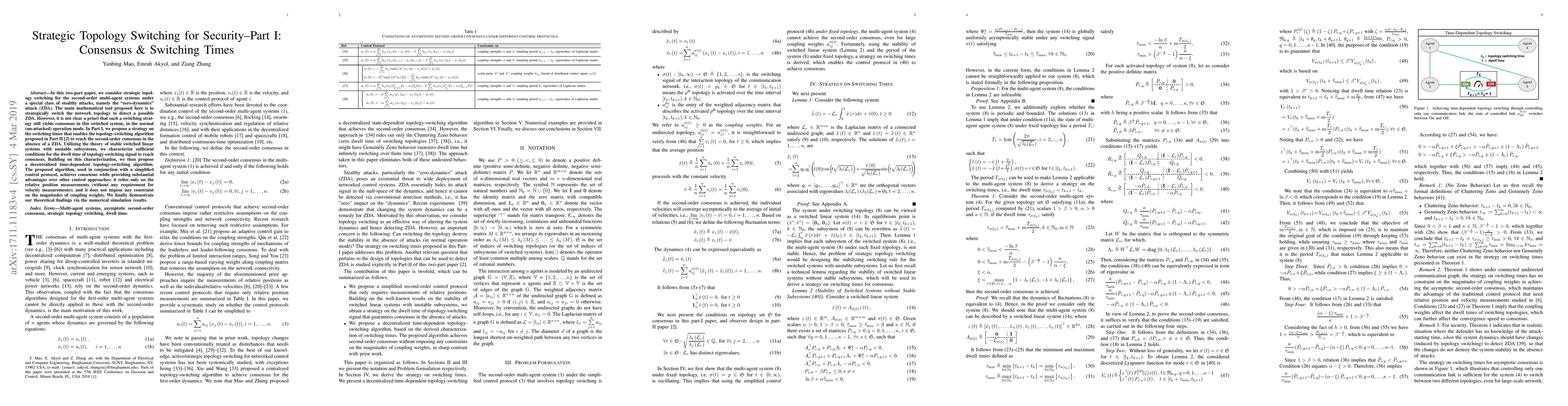 In this two-part paper, we consider strategic topology switching for the second-order multi-agent systems under a special class of stealthy attacks, namely the "zero-dynamics" attack (ZDA). The main mathematical tool proposed here is to strategically switch the network topology to detect a possible ZDA. However, it is not clear a priori that such a switching strategy still yields consensus in this switched system, in the normal (un-attacked) operation mode. In Part I, we propose a strategy on the switching times that enables the topology-switching algorithm proposed in Part II to reach the second-order consensus in the absence of a ZDA. Utilizing the theory of stable switched linear systems with unstable subsystems, we characterize sufficient conditions for the dwell time of topology-switching signal to reach consensus. Building on this characterization, we then propose a decentralized time-dependent topology-switching algorithm. The proposed algorithm, used in conjunction with a simplified control protocol, achieves consensus while providing substantial advantages over other control approaches: it relies only on the relative position measurements (without any requirement for velocity measurements); and it does not impose any constraint on the magnitudes of coupling weights. We finally demonstrate our theoretical findings via the numerical simulation results.