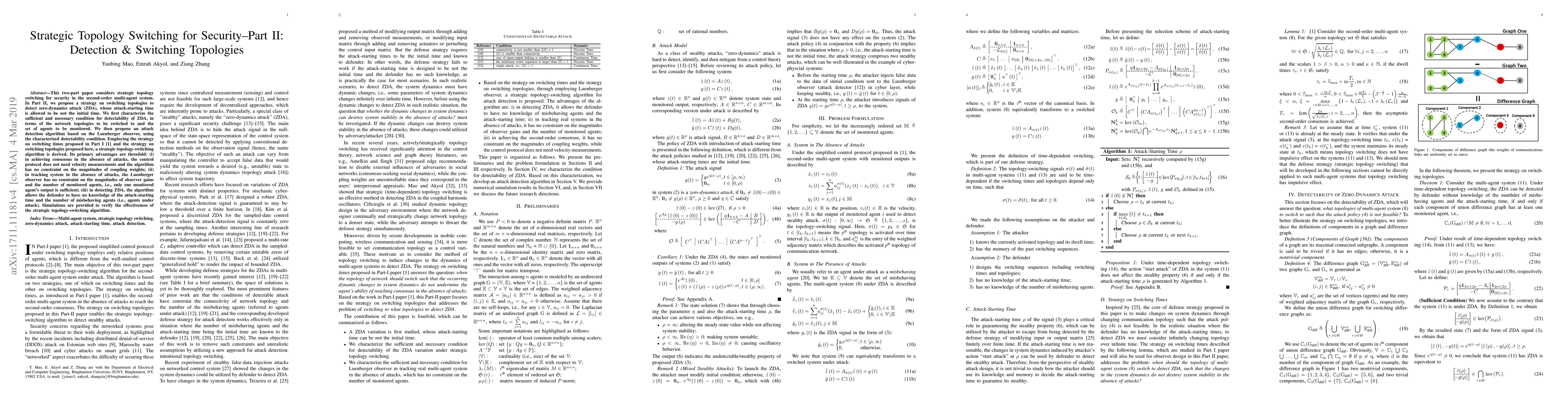 This two-part paper considers strategic topology switching for security in the second-order multi-agent system. In Part II, we propose a strategy on switching topologies to detect zero-dynamics attack (ZDA), whose attack-starting time is allowed to be not the initial time. We first characterize the sufficient and necessary condition for detectability of ZDA, in terms of the network topologies to be switched to and the set of agents to be monitored. We then propose an attack detection algorithm based on the Luenberger observer, using the characterized detectability condition. Employing the strategy on switching times proposed in Part I and the strategy on switching topologies proposed here, a strategic topology-switching algorithm is derived. Its primary advantages are threefold: (i) in achieving consensus in the absence of attacks, the control protocol does not need velocity measurements and the algorithm has no constraint on the magnitudes of coupling weights; (ii) in tracking system in the absence of attacks, the Luenberger observer has no constraint on the magnitudes of observer gains and the number of monitored agents, i.e., only one monitored agent's output is sufficient; (iii) in detecting ZDA, the algorithm allows the defender to have no knowledge of the attack-starting time and the number of misbehaving agents (i.e., agents under attack). Simulations are provided to verify the effectiveness of the strategic topology-switching algorithm.
