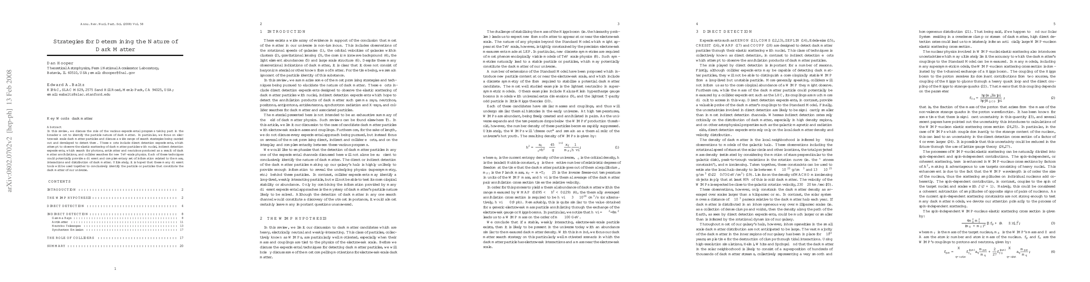 This review discusses various experimental strategies to identify dark matter particles, focusing on electroweak scale dark matter. These methods include direct detection of dark matter-nucleus scattering, indirect detection via photons, antimatter, and neutrinos from annihilations, and collider searches for new TeV-scale physics. The goal is to use these complementary techniques to determine dark matter's mass, interactions, and distribution, aiming for a definitive identification of dark matter particles.