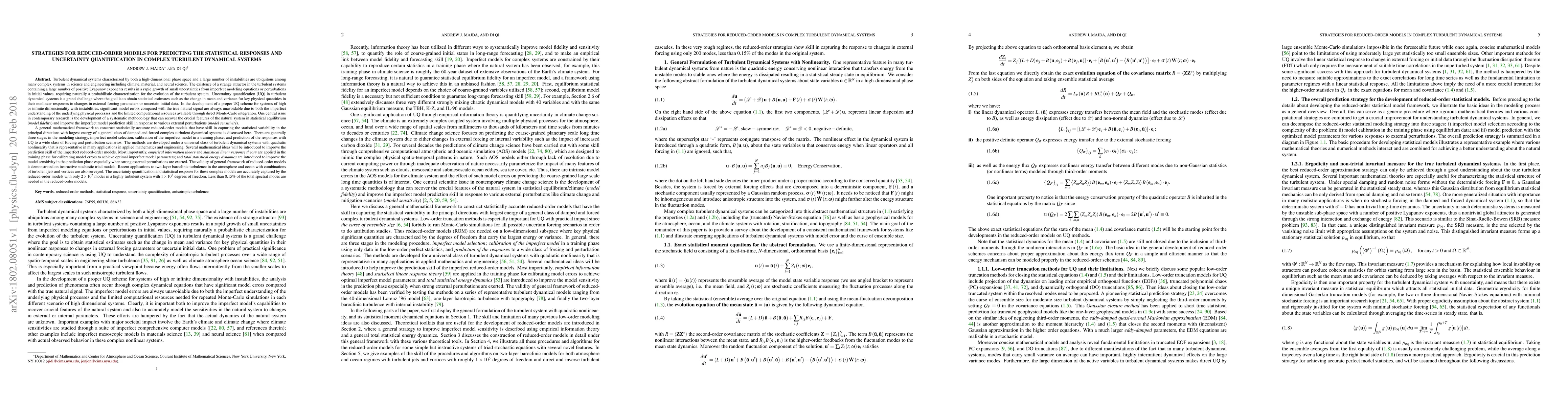 This paper develops a mathematical framework for constructing reduced-order models to predict statistical responses and quantify uncertainties in complex turbulent dynamical systems. The proposed methods aim to capture the principal statistical variability and improve model prediction accuracy under external perturbations.