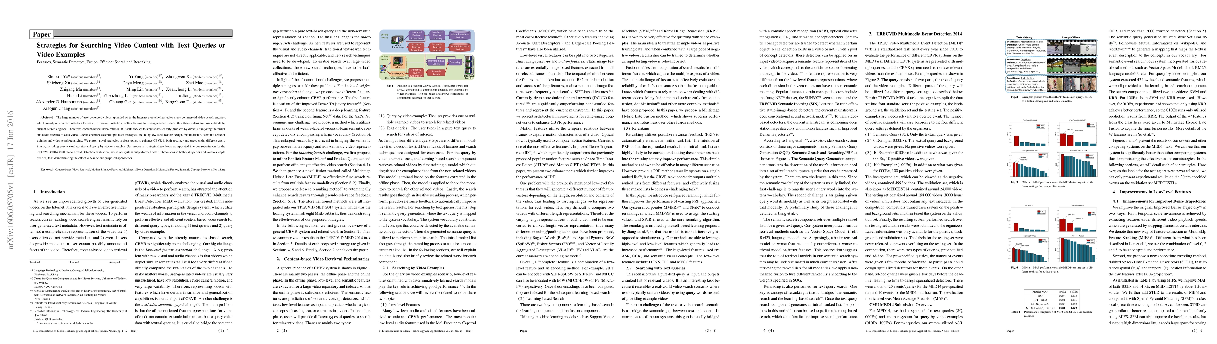 This paper proposes novel strategies to enhance content-based video retrieval (CBVR) for searching video content using text queries or video examples, addressing the metadata-scarcity issue. The strategies improve accuracy and speed, leading to superior performance in TRECVID 2014 evaluations.