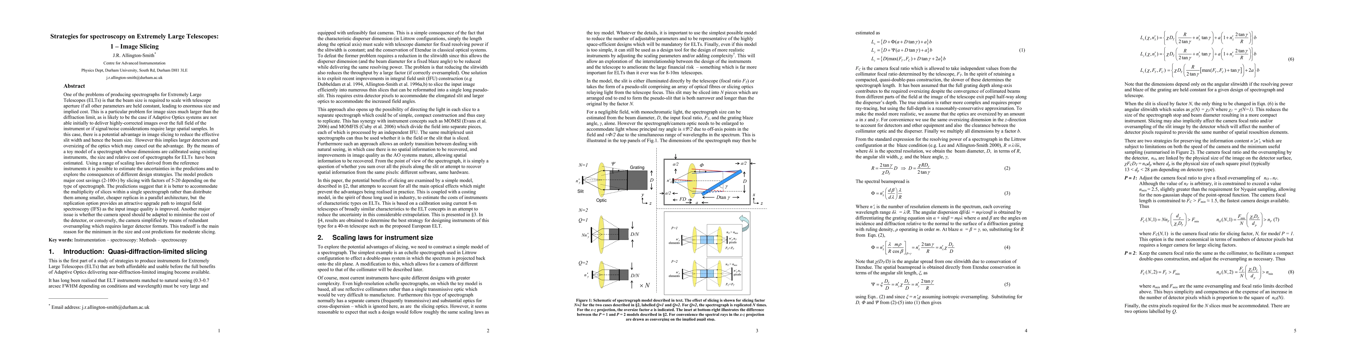 One of the problems of producing spectrographs for Extremely Large Telescopes (ELTs) is that the beam size is required to scale with telescope aperture if all other parameters are held constant, leading to enormous size and implied cost. This is a particular problem for image sizes much larger than the diffraction limit, as is likely to be the case if Adaptive Optics systems are not initially able to deliver highly corrected images over the full field of the instrument or if signal/noise considerations require large spatial samples. In this case, there is a potential advantage in image slicing to reduce the effective slitwidth and hence the beam size. However, this implies larger detectors and oversizing of the optics which may cancel out the advantage. By the means of a toy model of a spectrograph whose dimensions are calibrated using existing instruments, the size and relative cost of spectrographs for ELTs have been estimated. Using a range of scaling laws derived from the reference instruments, it is possible to estimate the uncertainties in the predictions and to explore the consequences of different design strategies. The model predicts major cost savings (2 - 100x) by slicing with factors of 5-20 depending on the type of spectrograph. The predictions suggest that it is better to accommodate the multiplicity of slices within a single spectrograph rather than distribute them among smaller, cheaper replicas in a parallel architecture, but the replication option provides an attractive upgrade path to integral field spectroscopy (IFS) as the input image quality is improved... [Full abstract in text]