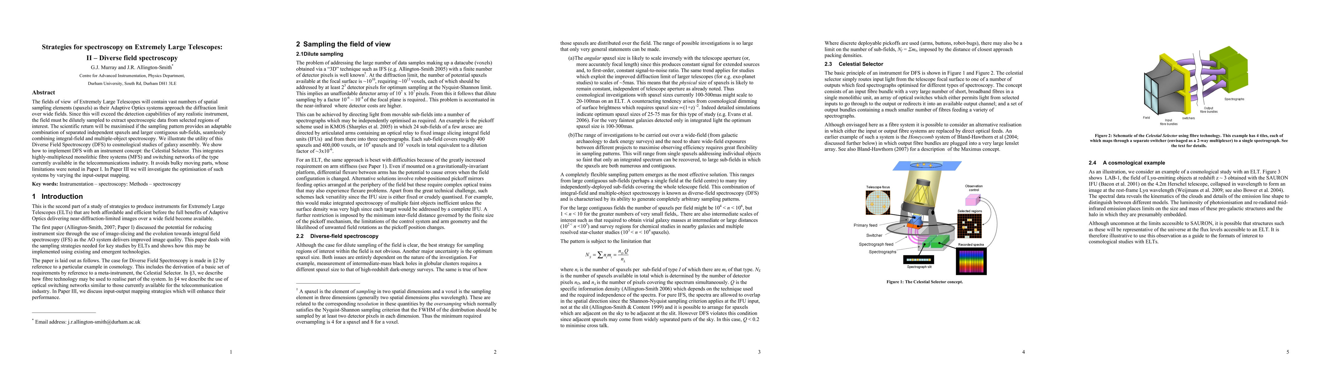 This paper discusses strategies for spectroscopy on Extremely Large Telescopes using Diverse Field Spectroscopy (DFS), which combines integral-field and multiple-object spectroscopy to efficiently sample vast fields of view. The Celestial Selector instrument concept, integrating monolithic fibre systems and switching networks, is proposed to implement DFS, avoiding bulky moving parts and maximizing scientific return for cosmological studies of galaxy assembly.