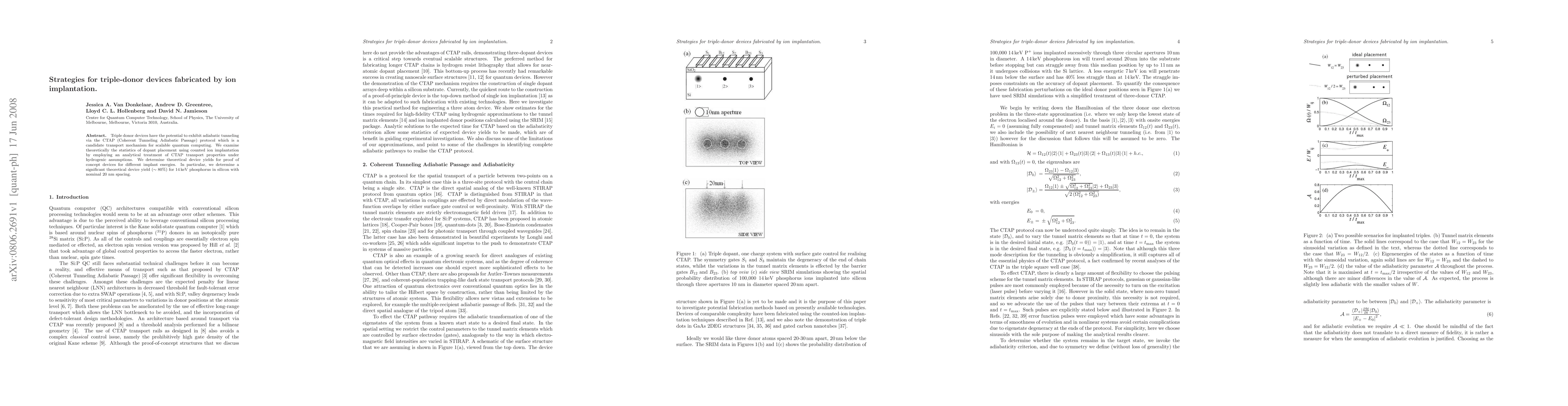 This paper explores theoretical strategies for fabricating triple-donor devices via ion implantation, focusing on the Coherent Tunneling Adiabatic Passage (CTAP) protocol for quantum computing. It reports a high theoretical device yield (~80%) for 14keV phosphorus in silicon with 20nm spacing, demonstrating promising potential for scalable quantum computing.