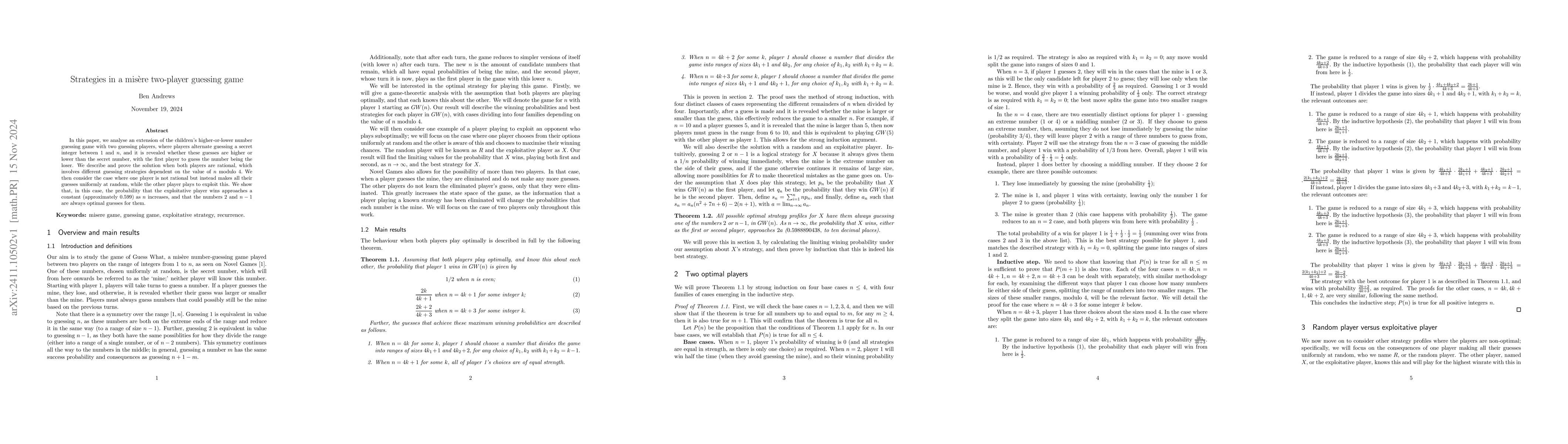This research paper analyzes strategies in a misère two-player guessing game where players alternately guess a secret integer aiming to lose by guessing the correct number. It proves optimal rational strategies based on n modulo 4 and examines the scenario where one player randomly guesses, showing that the rational player's win probability approaches 0.599 as n grows large.