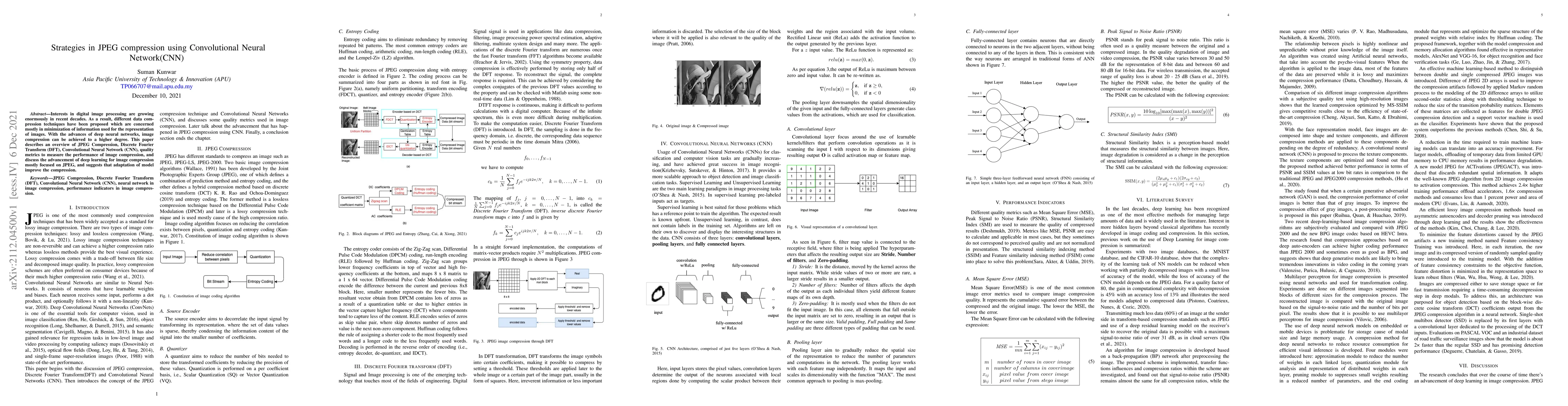 This paper reviews JPEG compression techniques, emphasizing Convolutional Neural Networks (CNN) for enhanced compression. It discusses the use of deep learning advancements to achieve higher compression ratios while maintaining image quality.